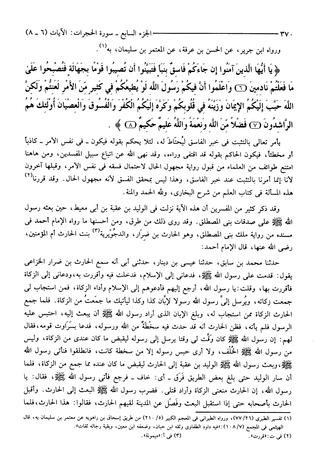 وَقَدْ ذَكَرَ كَثِيرٌ مِنَ الْمُفَسِّرِينَ أَنَّ هَذِهِ الْآيَةَ نَزَلَتْ فِي الْوَلِيدِ بْنِ عُقْبَةَ بْنِ أَبِي مُعَيْطٍ، حِينَ بَعَثَهُ رَسُولُ اللَّهِ صَلَّى اللَّهُ عَلَيْهِ وَسَلَّمَ عَلَى صَدَقَاتِ بَنِي الْمُصْطَلِقِ. وَقَدْ رُوِيَ ذَلِكَ مِنْ طُرُقٍ، وَمِنْ أَحْسَنِهَا مَا رَوَاهُ الْإِمَامُ أَحْمَدُ فِي مُسْنَدِهِ مِنْ رِوَايَةِ مَلِكِ بَنِي الْمُصْطَلِقِ، وَهُوَ الْحَارِثُ بْنُ ضِرَار، وَالِدُ جُويرية (3) بِنْتِ الْحَارِثِ أُمِّ الْمُؤْمِنِينَ، رَضِيَ اللَّهُ عَنْهَا، قَالَ الْإِمَامُ أَحْمَدُ: