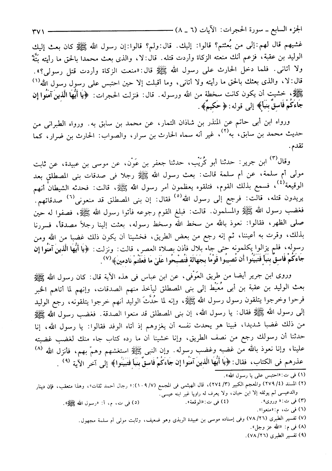 وَرَوَى ابْنُ جَرِيرٍ أَيْضًا مِنْ طَرِيقِ العَوْفي، عَنِ ابْنِ عَبَّاسٍ فِي هَذِهِ الْآيَةِ قَالَ: كَانَ رَسُولُ اللَّهِ صَلَّى اللَّهُ عَلَيْهِ وسلم بَعَثَ الْوَلِيدَ بْنَ عُقْبَةَ بْنِ أَبِي مُعَيْط إِلَى بَنِي الْمُصْطَلِقِ لِيَأْخُذَ مِنْهُمُ الصَّدَقَاتِ، وَإِنَّهُمْ لَمَّا أَتَاهُمُ الْخَبَرُ فَرِحُوا وَخَرَجُوا يَتَلَقَّوْنَ رَسُولَ رَسُولِ اللَّهِ صَلَّى اللَّهُ عَلَيْهِ وَسَلَّمَ، وَأَنَّهُ لَمَّا حُدِّثَ الْوَلِيدُ أَنَّهُمْ خَرَجُوا يَتَلَقَّوْنَهُ، رَجَعَ الْوَلِيدُ إِلَى رَسُولِ اللَّهِ صَلَّى اللَّهُ عَلَيْهِ وَسَلَّمَ فَقَالَ: يَا رَسُولَ اللَّهِ، إِنَّ بَنِي الْمُصْطَلِقِ قَدْ مَنَعُوا الصَّدَقَةَ. فَغَضِبَ رَسُولُ اللَّهِ صَلَّى اللَّهُ عَلَيْهِ وَسَلَّمَ مِنْ ذَلِكَ غَضَبًا شَدِيدًا، فَبَيْنَا هُوَ يُحَدِّثُ نَفْسَهُ أَنْ يَغْزُوَهُمْ إِذْ أَتَاهُ الْوَفْدُ فَقَالُوا: يَا رَسُولَ اللَّهِ، إِنَّا حُدِّثْنَا أَنَّ رَسُولَكَ رَجَعَ مِنْ نِصْفِ الطَّرِيقِ، وَإِنَّا خَشِينَا أَنَّ مَا رَدَّهُ كِتَابٌ جَاءَ مِنْكَ لِغَضَبٍ غَضِبْتَهُ عَلَيْنَا، وَإِنَّا نَعُوذُ بِاللَّهِ مِنْ غَضَبِهِ وَغَضَبِ رَسُولِهِ. وَإِنَّ النَّبِيَّ صَلَّى اللَّهُ عَلَيْهِ وَسَلَّمَ اسْتَغَشَّهُمْ وَهَمَّ بِهِمْ، فَأَنْزَلَ اللَّهُ (8) عُذْرَهُمْ فِي الْكِتَابِ، فَقَالَ: {يَا أَيُّهَا الَّذِينَ آمَنُوا إِنْ جَاءَكُمْ فَاسِقٌ بِنَبَإٍ فَتَبَيَّنُوا} إلى آخر الآية (9) .