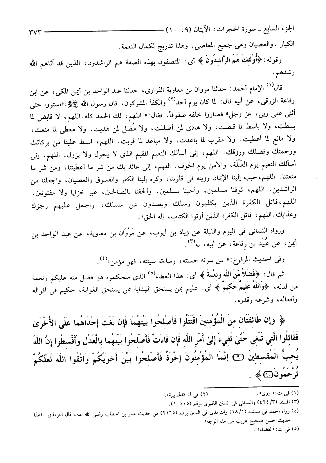 قَالَ (1) الْإِمَامُ أَحْمَدُ: حَدَّثَنَا مَرْوَانُ بْنُ مُعَاوِيَةَ الْفَزَارِيُّ، حَدَّثَنَا عَبْدُ الْوَاحِدِ بْنُ أَيْمَنَ الْمَكِّيُّ، عَنِ ابْنِ رَفَاعَةَ الزُّرَقِيِّ، عَنْ أَبِيهِ قَالَ: لَمَّا كَانَ يَوْمُ أُحُدٍ (2) وَانْكَفَأَ الْمُشْرِكُونَ، قَالَ رَسُولُ اللَّهِ صَلَّى اللَّهُ عَلَيْهِ وَسَلَّمَ: "اسْتَوُوا حَتَّى أُثْنِيَ عَلَى رَبِّي، عَزَّ وَجَلَّ" فَصَارُوا خَلْفَهُ صُفُوفًا، فَقَالَ: "اللَّهُمَّ لَكَ الْحَمْدُ كُلُّهُ. اللَّهُمَّ لَا قَابِضَ لِمَا بَسَطْتَ، وَلَا بَاسِطَ لِمَا قَبَضْتَ، وَلَا هَادِيَ لِمَنْ أَضْلَلْتَ، وَلَا مُضل لِمَنْ هَدَيْتَ. وَلَا مُعْطِيَ لِمَا مَنَعْتَ، وَلَا مَانِعَ لِمَا أَعْطَيْتَ. وَلَا مُقَرِّبَ لِمَا بَاعَدْتَ، وَلَا مُبَاعِدَ لِمَا قَرَّبْتَ. اللَّهُمَّ ابْسُطْ عَلَيْنَا مِنْ بَرَكَاتِكَ وَرَحْمَتِكَ وَفَضْلِكَ وَرِزْقِكَ. اللَّهُمَّ، إِنِّي أَسْأَلُكَ النَّعِيمُ الْمُقِيمُ الَّذِي لَا يَحُولُ وَلَا يَزُولُ. اللَّهُمَّ إِنِّي أَسْأَلُكَ النَّعِيمَ يَوْمَ العَيْلَة، وَالْأَمْنَ يَوْمَ الْخَوْفِ. اللَّهُمَّ إِنَّى عَائِذٌ بِكَ مِنْ شَرِّ مَا أَعْطَيْتَنَا، وَمِنْ شَرٍّ مَا مَنَعْتَنَا. اللَّهُمَّ حَبِّبْ إِلَيْنَا الْإِيمَانَ وَزَيِّنْهُ فِي قُلُوبِنَا، وَكَرِّهْ إِلَيْنَا الْكُفْرَ وَالْفُسُوقَ وَالْعِصْيَانَ، وَاجْعَلْنَا مِنَ الرَّاشِدِينَ. اللَّهُمَّ، تَوَفَّنَا مُسْلِمِينَ، وَأَحْيِنَا مُسْلِمِينَ، وَأَلْحِقْنَا بِالصَّالِحِينَ، غَيْرَ خَزَايَا وَلَا مَفْتُونِينَ. اللَّهُمَّ، قَاتِلِ الْكَفَرَةَ الَّذِينَ يُكَذِّبُونَ رُسُلَكَ وَيَصُدُّونَ عَنْ سَبِيلِكَ، وَاجْعَلْ عَلَيْهِمْ رِجْزَكَ وَعَذَابَكَ. اللَّهُمَّ قَاتِلِ الْكَفَرَةَ الَّذِينَ أُوتُوا الْكِتَابَ، إِلَهَ الْحَقِّ".