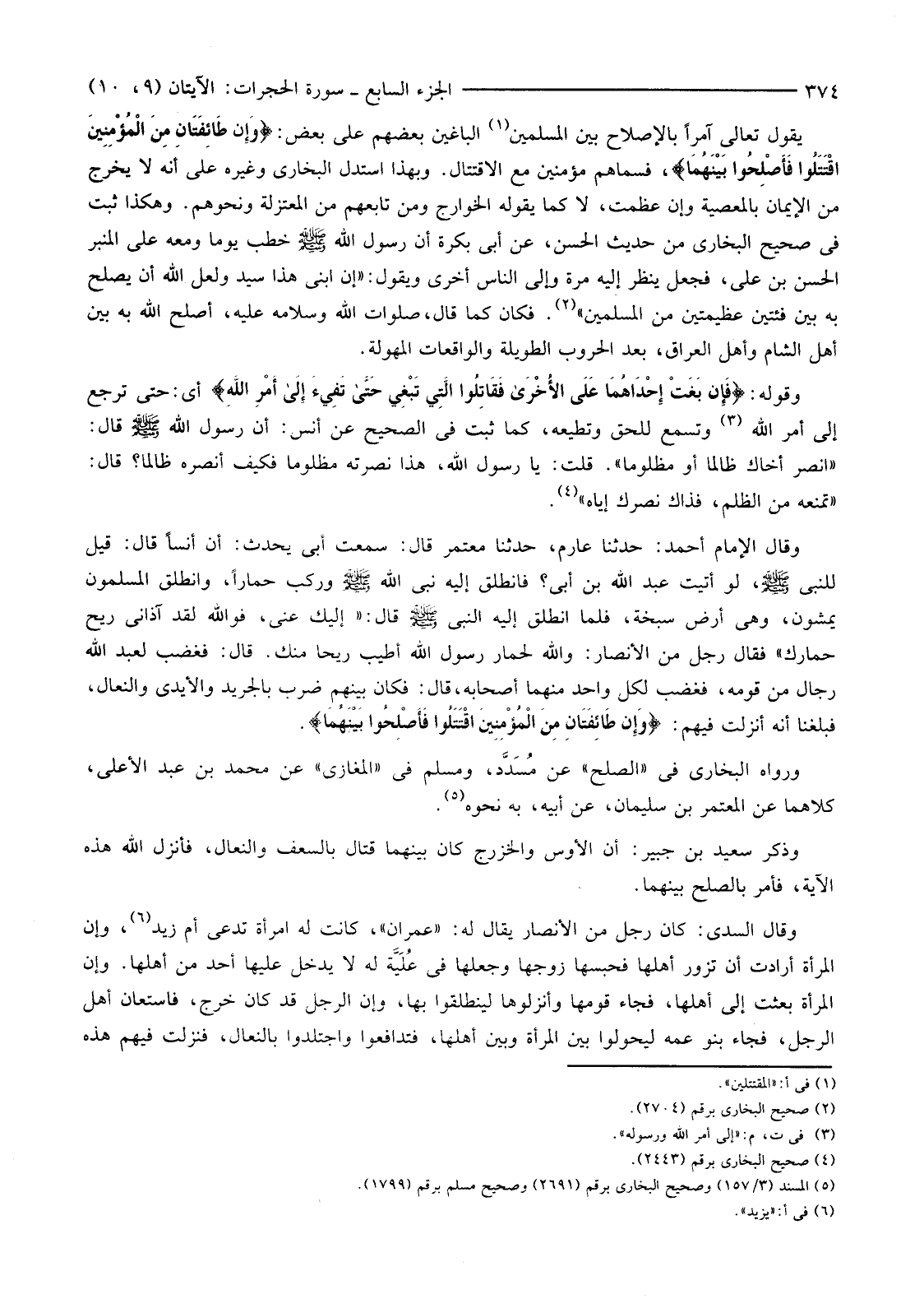 يَقُولُ تَعَالَى آمِرًا بِالْإِصْلَاحِ بَيْنَ الْمُسْلِمِينَ (1) الْبَاغِينَ بَعْضُهُمْ عَلَى بَعْضٍ: {وَإِنْ طَائِفَتَانِ مِنَ الْمُؤْمِنِينَ اقْتَتَلُوا فَأَصْلِحُوا بَيْنَهُمَا} ، فَسَمَّاهُمْ مُؤْمِنِينَ مَعَ الِاقْتِتَالِ. وَبِهَذَا اسْتَدَلَّ الْبُخَارِيُّ وَغَيْرُهُ عَلَى أَنَّهُ لَا يَخْرُجُ مِنَ الْإِيمَانِ بِالْمَعْصِيَةِ وَإِنْ عَظُمَتْ، لَا كَمَا يَقُولُهُ الْخَوَارِجُ وَمَنْ تَابَعَهُمْ مِنَ الْمُعْتَزِلَةِ وَنَحْوِهِمْ. وَهَكَذَا ثَبَتَ فِي صَحِيحِ الْبُخَارِيِّ مِنْ حَدِيثِ الْحَسَنِ، عَنْ أَبِي بَكْرَةَ أَنَّ رَسُولَ اللَّهِ صَلَّى اللَّهُ عَلَيْهِ وَسَلَّمَ خَطَبَ يَوْمًا وَمَعَهُ عَلَى الْمِنْبَرِ الْحَسَنُ بْنُ عَلِيٍّ، فَجَعَلَ يَنْظُرُ إِلَيْهِ مَرَّةً وَإِلَى النَّاسِ أُخْرَى وَيَقُولُ: "إِنَّ ابْنِي هَذَا سَيِّدٌ وَلَعَلَّ اللَّهَ أَنْ يُصْلِحَ بِهِ بَيْنَ فِئَتَيْنِ عَظِيمَتَيْنِ مِنَ الْمُسْلِمِينَ" (2) . فَكَانَ كَمَا قَالَ، صَلَوَاتُ اللَّهِ وَسَلَامُهُ عَلَيْهِ، أَصْلَحَ اللَّهُ بِهِ بَيْنَ أَهْلِ الشَّامِ وَأَهْلِ الْعِرَاقِ، بَعْدَ الْحُرُوبِ الطَّوِيلَةِ وَالْوَاقِعَاتِ الْمَهُولَةِ.