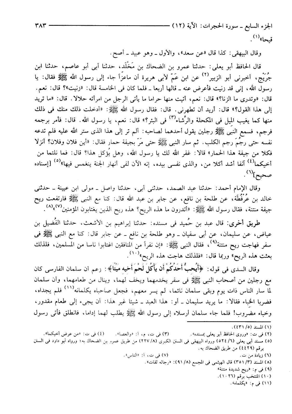 وَقَالَ السُّدِّيُّ فِي قَوْلِهِ: {أَيُحِبُّ أَحَدُكُمْ أَنْ يَأْكُلَ لَحْمَ أَخِيهِ مَيْتًا} : زَعَمَ أَنَّ سَلْمَانَ الْفَارِسِيَّ كَانَ مَعَ رَجُلَيْنِ مِنْ أَصْحَابِ النَّبِيِّ صَلَّى اللَّهُ عَلَيْهِ وَسَلَّمَ فِي سَفَرٍ يَخْدُمُهُمَا وَيَخِفُّ لَهُمَا، وَيَنَالُ مِنْ طَعَامِهِمَا، وَأَنَّ سَلْمَانَ لَمَّا سَارَ النَّاسُ ذَاتَ يَوْمٍ وَبَقِيَ سَلْمَانُ نَائِمًا، لَمْ يَسِرْ مَعَهُمْ، فَجَعَلَ صَاحِبَاهُ يُكَلِّمَانِهِ (11) فَلَمْ يَجِدَاهُ، فَضَرَبَا الخِباء فقالا ما يريد سليمان -أَوْ: هَذَا الْعَبْدُ-شَيْئًا غَيْرَ هَذَا: أَنْ يَجِيءَ إِلَى طَعَامٍ مَقْدُورٍ، وَخِبَاءٍ مَضْرُوبٍ! فَلَمَّا جَاءَ سَلْمَانُ أَرْسَلَاهُ إِلَى رَسُولِ اللَّهِ صَلَّى اللَّهُ عَلَيْهِ وَسَلَّمَ يَطْلُبُ لَهُمَا إِدَامًا، فَانْطَلَقَ فأتى رسول