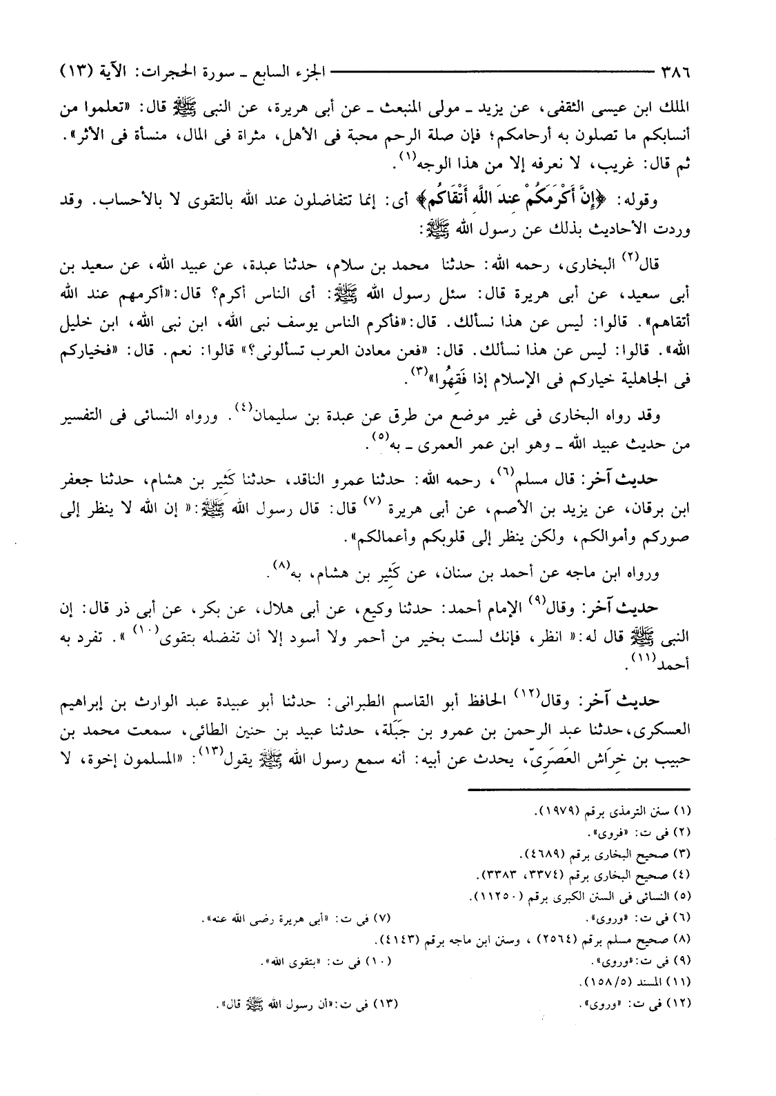 وَقَوْلُهُ: {إِنَّ أَكْرَمَكُمْ عِنْدَ اللَّهِ أَتْقَاكُمْ} أَيْ: إِنَّمَا تَتَفَاضَلُونَ عِنْدَ اللَّهِ بِالتَّقْوَى لَا بِالْأَحْسَابِ. وَقَدْ وَرَدَتِ الْأَحَادِيثُ بِذَلِكَ عَنْ رَسُولِ اللَّهِ صَلَّى اللَّهُ عَلَيْهِ وَسَلَّمَ: