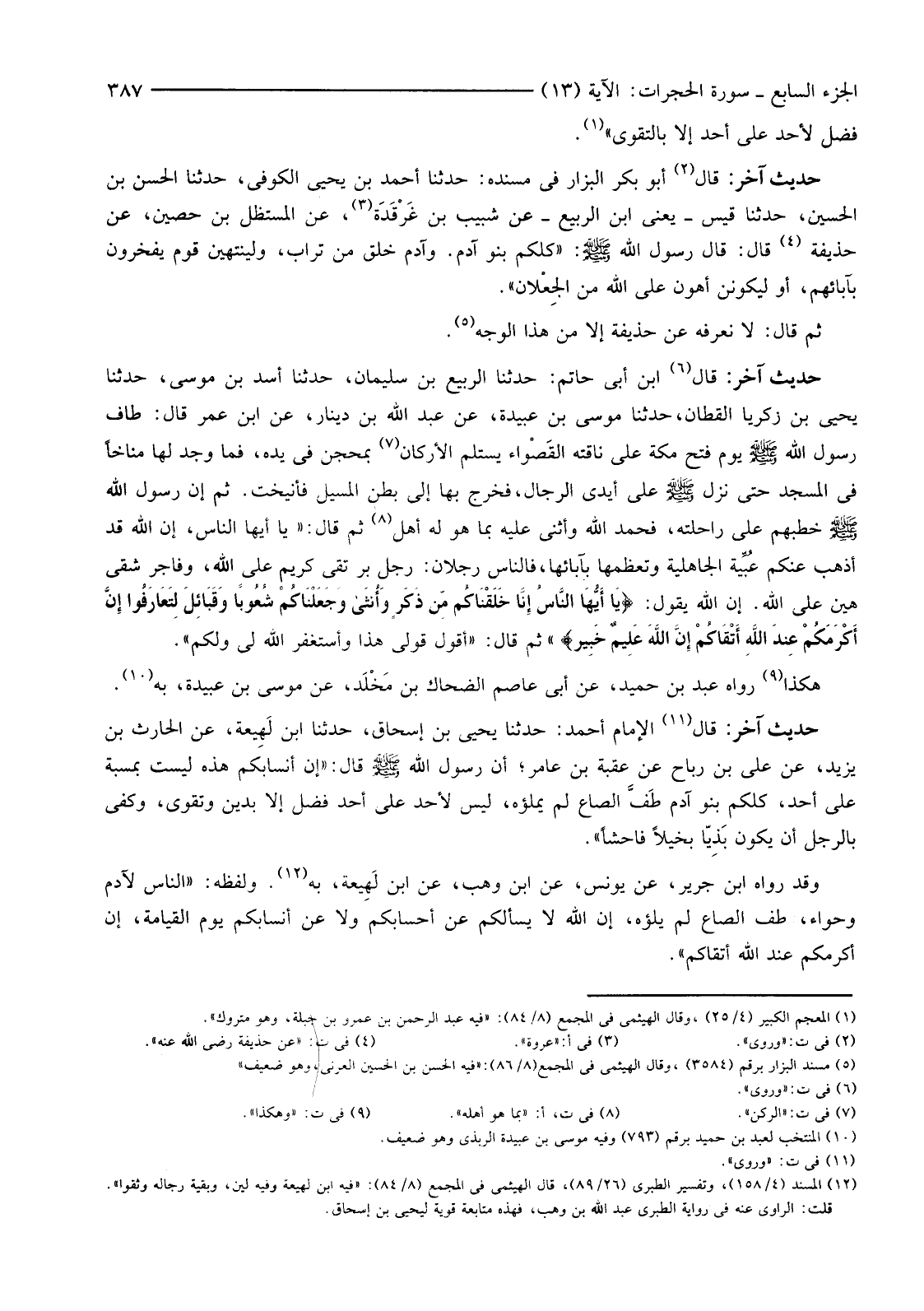 حَدِيثٌ آخَرُ: قَالَ (6) ابْنُ أَبِي حَاتِمٍ: حَدَّثَنَا الرَّبِيعِ بْنِ سُلَيْمَانَ، حَدَّثَنَا أَسَدُ بْنُ مُوسَى، حَدَّثَنَا يَحْيَى بْنُ زَكَرِيَّا الْقَطَّانُ، حَدَّثَنَا مُوسَى بْنُ عُبَيْدَةَ، عَنْ عَبْدِ اللَّهِ بْنِ دِينَارٍ، عَنِ ابْنِ عمر قَالَ: طَافَ رَسُولُ اللَّهِ صَلَّى اللَّهُ عَلَيْهِ وَسَلَّمَ يَوْمَ فَتْحِ مَكَّةَ عَلَى نَاقَتِهِ القَصْواء يَسْتَلِمُ الْأَرْكَانَ (7) بِمِحْجَنٍ فِي يَدِهِ، فَمَا وَجَدَ لَهَا مُنَاخًا فِي الْمَسْجِدِ حَتَّى نَزَلَ صَلَّى اللَّهُ عَلَيْهِ وَسَلَّمَ عَلَى أَيْدِي الرِّجَالِ، فَخَرَجَ بِهَا إِلَى بَطْنِ الْمَسِيلِ فَأُنِيخَتْ. ثُمَّ إِنَّ رَسُولَ اللَّهِ صَلَّى اللَّهُ عَلَيْهِ وَسَلَّمَ خَطَبَهُمْ عَلَى رَاحِلَتِهِ، فَحَمِدَ اللَّهَ وَأَثْنَى عَلَيْهِ بِمَا هُوَ لَهُ أَهْلٌ (8) ثُمَّ قَالَ: "يَا أَيُّهَا النَّاسُ، إِنَّ اللَّهَ قَدْ أَذْهَبَ عَنْكُمْ عُبِّية الْجَاهِلِيَّةِ وَتُعَظُّمَهَا بِآبَائِهَا، فَالنَّاسُ رَجُلَانِ: رَجُلٌ بَرٌّ تَقِيٌّ كَرِيمٌ عَلَى اللَّهِ، وَفَاجِرٌ شَقِيٌّ هَيِّنٌ عَلَى اللَّهِ. إِنَّ اللَّهَ يَقُولُ: {يَا أَيُّهَا النَّاسُ إِنَّا خَلَقْنَاكُمْ مِنْ ذَكَرٍ وَأُنْثَى وَجَعَلْنَاكُمْ شُعُوبًا وَقَبَائِلَ لِتَعَارَفُوا إِنَّ أَكْرَمَكُمْ عِنْدَ اللَّهِ أَتْقَاكُمْ إِنَّ اللَّهَ عَلِيمٌ خَبِيرٌ} ثُمَّ قَالَ: "أَقُولُ قَوْلِي هَذَا وَأَسْتَغْفِرُ اللَّهَ لِي وَلَكُمْ".