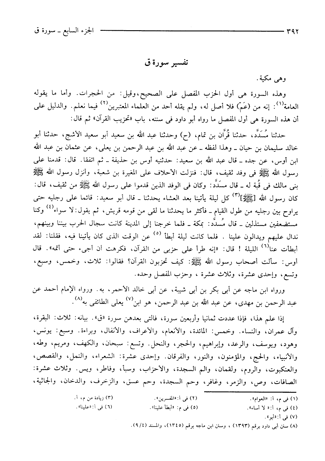 إِذَا عُلِمَ هَذَا، فَإِذَا عَدَدْتَ ثَمَانِيًا وَأَرْبَعِينَ سُورَةً، فَالَّتِي بَعْدَهُنَّ سُورَةُ "ق". بَيَانُهُ: ثَلَاثٌ: الْبَقَرَةُ، وَآلُ عِمْرَانَ، وَالنِّسَاءُ. وَخَمْسٌ: الْمَائِدَةُ، وَالْأَنْعَامُ، وَالْأَعْرَافُ، وَالْأَنْفَالُ، وَبَرَاءَةُ. وَسَبْعٌ: يُونُسُ، وَهُودٌ، وَيُوسُفُ، وَالرَّعْدُ، وَإِبْرَاهِيمُ، وَالْحِجْرُ، وَالنَّحْلُ. وَتِسْعٌ: سُبْحَانَ، وَالْكَهْفُ، وَمَرْيَمُ، وَطَهَ، وَالْأَنْبِيَاءُ، وَالْحَجُّ، وَالْمُؤْمِنُونَ، وَالنُّورُ، وَالْفُرْقَانُ. وَإِحْدَى عَشْرَةَ: الشُّعَرَاءُ، وَالنَّمْلُ، وَالْقَصَصُ، وَالْعَنْكَبُوتُ، وَالرُّومُ، ولقمان، والم، السَّجْدَةِ، وَالْأَحْزَابُ، وَسَبَأٌ، وَفَاطِرٌ، وَيس. وَثَلَاثَ عشرة: الصافات، وص، والزمر، وغافر، وحم، السجدة، وحم عسق، والزخرف، والدخان، والجاثية،