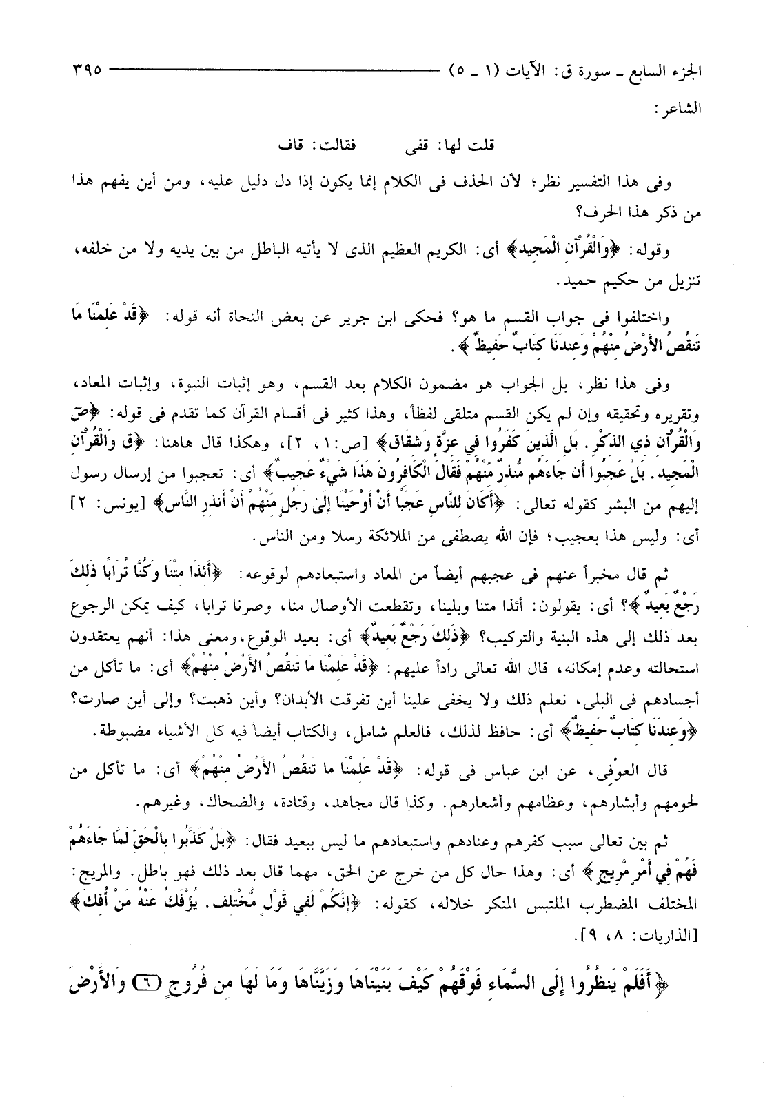 وَفِي هَذَا نَظَرٌ، بَلِ الْجَوَابُ هُوَ مَضْمُونُ الْكَلَامِ بَعْدَ الْقَسَمِ، وَهُوَ إِثْبَاتُ النُّبُوَّةِ، وَإِثْبَاتُ الْمَعَادِ، وَتَقْرِيرُهُ وَتَحْقِيقُهُ وَإِنْ لَمْ يَكُنِ الْقَسَمُ مُتَلَقًّى لَفْظًا، وَهَذَا كَثِيرٌ فِي أَقْسَامِ الْقُرْآنِ كَمَا تَقَدَّمَ فِي قَوْلِهِ: {ص وَالْقُرْآنِ ذِي الذِّكْرِ بَلِ الَّذِينَ كَفَرُوا فِي عِزَّةٍ وَشِقَاقٍ} [ص: 1، 2] ، وَهَكَذَا قَالَ هَاهُنَا: {ق وَالْقُرْآنِ الْمَجِيدِ بَلْ عَجِبُوا أَنْ جَاءَهُمْ مُنْذِرٌ مِنْهُمْ فَقَالَ الْكَافِرُونَ هَذَا شَيْءٌ عَجِيبٌ} أَيْ: تَعَجَّبُوا مِنْ إِرْسَالِ رَسُولٍ إِلَيْهِمْ مِنَ الْبَشَرِ كَقَوْلِهِ تَعَالَى: {أَكَانَ لِلنَّاسِ عَجَبًا أَنْ أَوْحَيْنَا إِلَى رَجُلٍ مِنْهُمْ أَنْ أَنْذِرِ النَّاسَ} [يُونُسَ: 2] أَيْ: وَلَيْسَ هَذَا بِعَجِيبٍ؛ فَإِنَّ اللَّهُ يَصْطَفِي مِنَ الْمَلَائِكَةِ رُسُلًا وَمِنَ النَّاسِ.