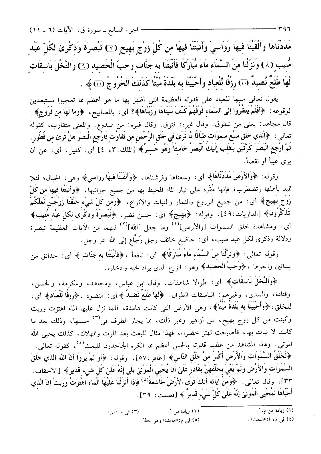 {أَفَلَمْ يَنْظُرُوا إِلَى السَّمَاءِ فَوْقَهُمْ كَيْفَ بَنَيْنَاهَا وَزَيَّنَّاهَا وَمَا لَهَا مِنْ فُرُوجٍ (6) وَالأرْضَ مَدَدْنَاهَا وَأَلْقَيْنَا فِيهَا رَوَاسِيَ وَأَنْبَتْنَا فِيهَا مِنْ كُلِّ زَوْجٍ بَهِيجٍ (7) تَبْصِرَةً وَذِكْرَى لِكُلِّ عَبْدٍ مُنِيبٍ (8) وَنزلْنَا مِنَ السَّمَاءِ مَاءً مُبَارَكًا فَأَنْبَتْنَا بِهِ جَنَّاتٍ وَحَبَّ الْحَصِيدِ (9) وَالنَّخْلَ بَاسِقَاتٍ لَهَا طَلْعٌ نَضِيدٌ (10) رِزْقًا لِلْعِبَادِ وَأَحْيَيْنَا بِهِ بَلْدَةً مَيْتًا كَذَلِكَ الْخُرُوجُ (11) }
