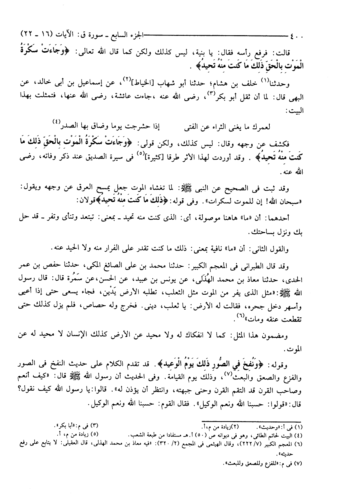 فَكَشَفَ عَنْ وَجْهِهِ وَقَالَ: لَيْسَ كَذَلِكَ، وَلَكِنَّ قَوْلِي: {وَجَاءَتْ سَكْرَةُ الْمَوْتِ بِالْحَقِّ ذَلِكَ مَا كُنْتَ مِنْهُ تَحِيدُ} وَقَدْ أَوْرَدْتُ لِهَذَا الْأَثَرِ طُرُقًا [كَثِيرَةً] (5) فِي سِيرَةِ الصِّدِّيقِ عِنْدَ ذِكْرِ وَفَاتِهِ، رَضِيَ اللَّهُ عَنْهُ.