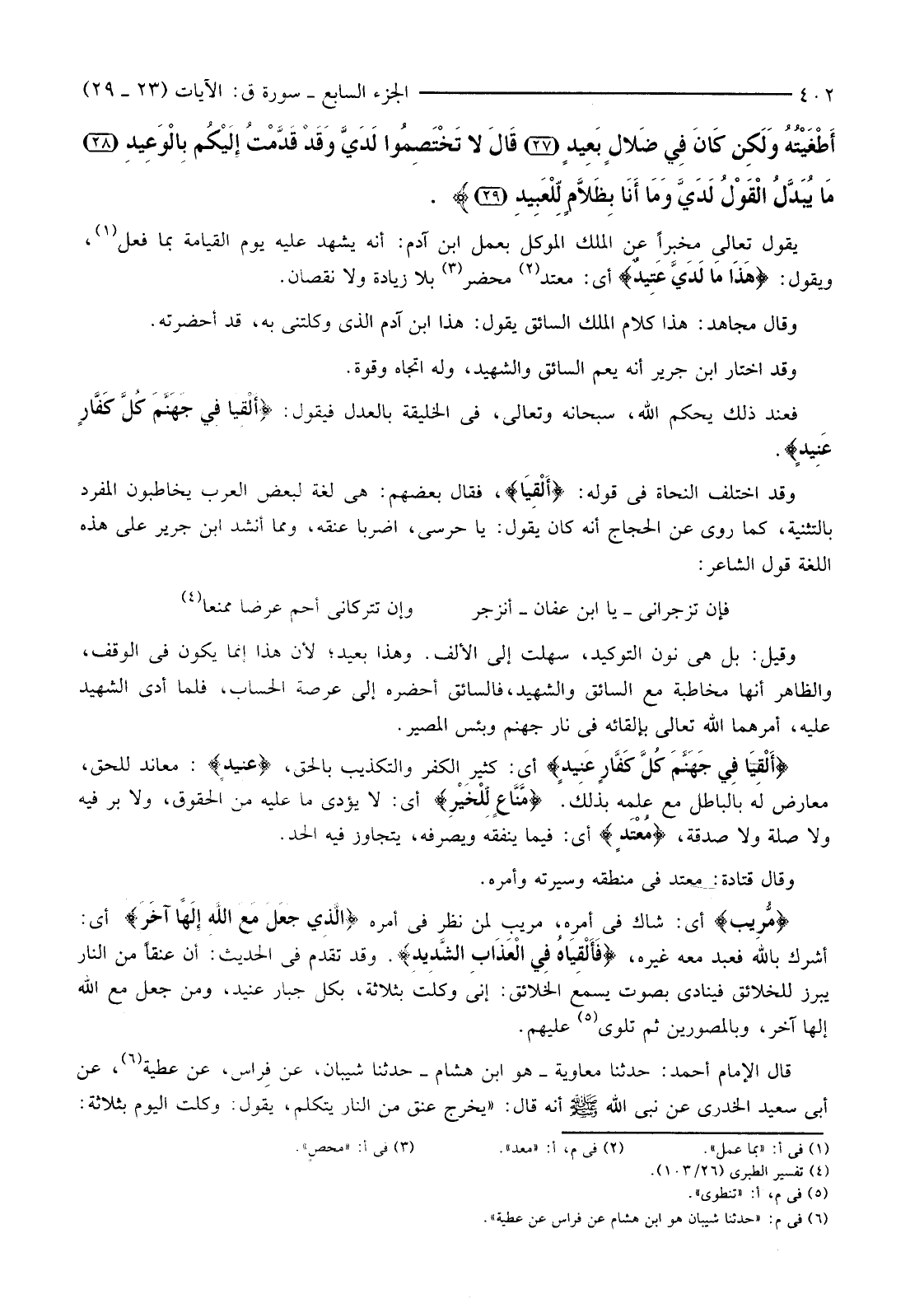 {وَقَالَ قَرِينُهُ هَذَا مَا لَدَيَّ عَتِيدٌ (23) أَلْقِيَا فِي جَهَنَّمَ كُلَّ كَفَّارٍ عَنِيدٍ (24) مَنَّاعٍ لِلْخَيْرِ مُعْتَدٍ مُرِيبٍ (25) الَّذِي جَعَلَ مَعَ اللَّهِ إِلَهًا آخَرَ فَأَلْقِيَاهُ فِي الْعَذَابِ الشَّدِيدِ (26) قَالَ قَرِينُهُ رَبَّنَا مَا أَطْغَيْتُهُ وَلَكِنْ كَانَ فِي ضَلالٍ بَعِيدٍ (27) قَالَ لَا تَخْتَصِمُوا لَدَيَّ وَقَدْ قَدَّمْتُ إِلَيْكُمْ بِالْوَعِيدِ (28) مَا يُبَدَّلُ الْقَوْلُ لَدَيَّ وَمَا أَنَا بِظَلامٍ لِلْعَبِيدِ (29) }