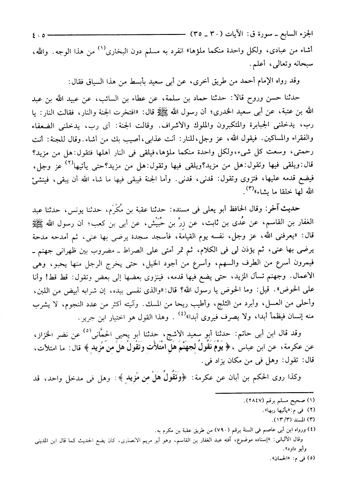 حَدَّثَنَا حَسَنٌ وَرَوْحٌ قَالَا حَدَّثَنَا حَمَّادُ بْنُ سَلَمَةَ، عَنْ عَطَاءِ بْنِ السَّائِبِ، عَنْ عُبَيْدِ اللَّهِ بْنِ عَبْدِ اللَّهِ بْنِ عُتْبَةَ، عَنْ أَبِي سَعِيدٍ الْخُدْرِيِّ؛ أَنَّ رَسُولَ اللَّهِ صَلَّى اللَّهُ عَلَيْهِ وَسَلَّمَ قَالَ: "افْتَخَرَتِ الْجَنَّةُ وَالنَّارُ، فَقَالَتِ النَّارُ: يَا رَبِّ، يَدْخُلُنِي الْجَبَابِرَةُ وَالْمُتَكَبِّرُونَ وَالْمُلُوكُ وَالْأَشْرَافُ. وَقَالَتِ الْجَنَّةُ: أَيْ رَبِّ، يَدْخُلُنِي الضُّعَفَاءُ وَالْفُقَرَاءُ وَالْمَسَاكِينُ. فَيَقُولُ اللَّهُ، عَزَّ وَجَلَّ، لِلنَّارِ: أَنْتِ عَذَابِي، أُصِيبُ بِكِ مَنْ أَشَاءُ. وَقَالَ لِلْجَنَّةِ: أَنْتِ رَحْمَتِي، وَسِعَتْ كُلَّ شَيْءٍ، وَلِكُلِّ وَاحِدَةٍ مِنْكُمَا مِلْؤُهَا، فَيُلْقَى فِي النَّارِ أَهْلُهَا فَتَقُولُ: هَلْ مِنْ مَزِيدٍ؟ قَالَ: وَيُلْقَى فِيهَا وَتَقُولُ: هَلْ مِنْ مَزِيدٍ؟ وَيُلْقَى فِيهَا وَتَقُولُ: هَلْ مِنْ مَزِيدٍ؟ حَتَّى يَأْتِيَهَا (2) عَزَّ وَجَلَّ، فَيَضَعَ قَدَمَهُ عَلَيْهَا، فَتُزْوَى وَتَقُولُ: قَدِنِي، قَدِنِي. وَأَمَّا الْجَنَّةُ فَيَبْقَى فِيهَا مَا شَاءَ اللَّهُ أَنْ يَبْقَى، فَيُنْشِئُ اللَّهُ لَهَا خَلْقًا مَا يَشَاءُ" (3) .
