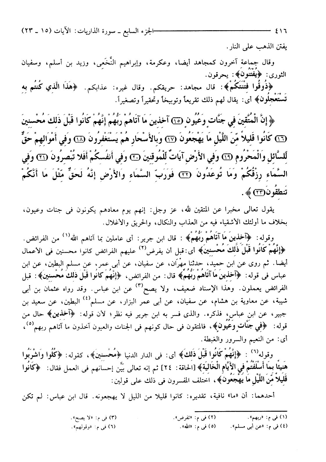{إِنَّ الْمُتَّقِينَ فِي جَنَّاتٍ وَعُيُونٍ (15) آخِذِينَ مَا آتَاهُمْ رَبُّهُمْ إِنَّهُمْ كَانُوا قَبْلَ ذَلِكَ مُحْسِنِينَ (16) كَانُوا قَلِيلا مِنَ اللَّيْلِ مَا يَهْجَعُونَ (17) وَبِالأسْحَارِ هُمْ يَسْتَغْفِرُونَ (18) وَفِي أَمْوَالِهِمْ حَقٌّ لِلسَّائِلِ وَالْمَحْرُومِ (19) وَفِي الأرْضِ آيَاتٌ لِلْمُوقِنِينَ (20) وَفِي أَنْفُسِكُمْ أَفَلا تُبْصِرُونَ (21) وَفِي السَّمَاءِ رِزْقُكُمْ وَمَا تُوعَدُونَ (22) فَوَرَبِّ السَّمَاءِ وَالأرْضِ إِنَّهُ لَحَقٌّ مِثْلَ مَا أَنَّكُمْ تَنْطِقُونَ (23) }