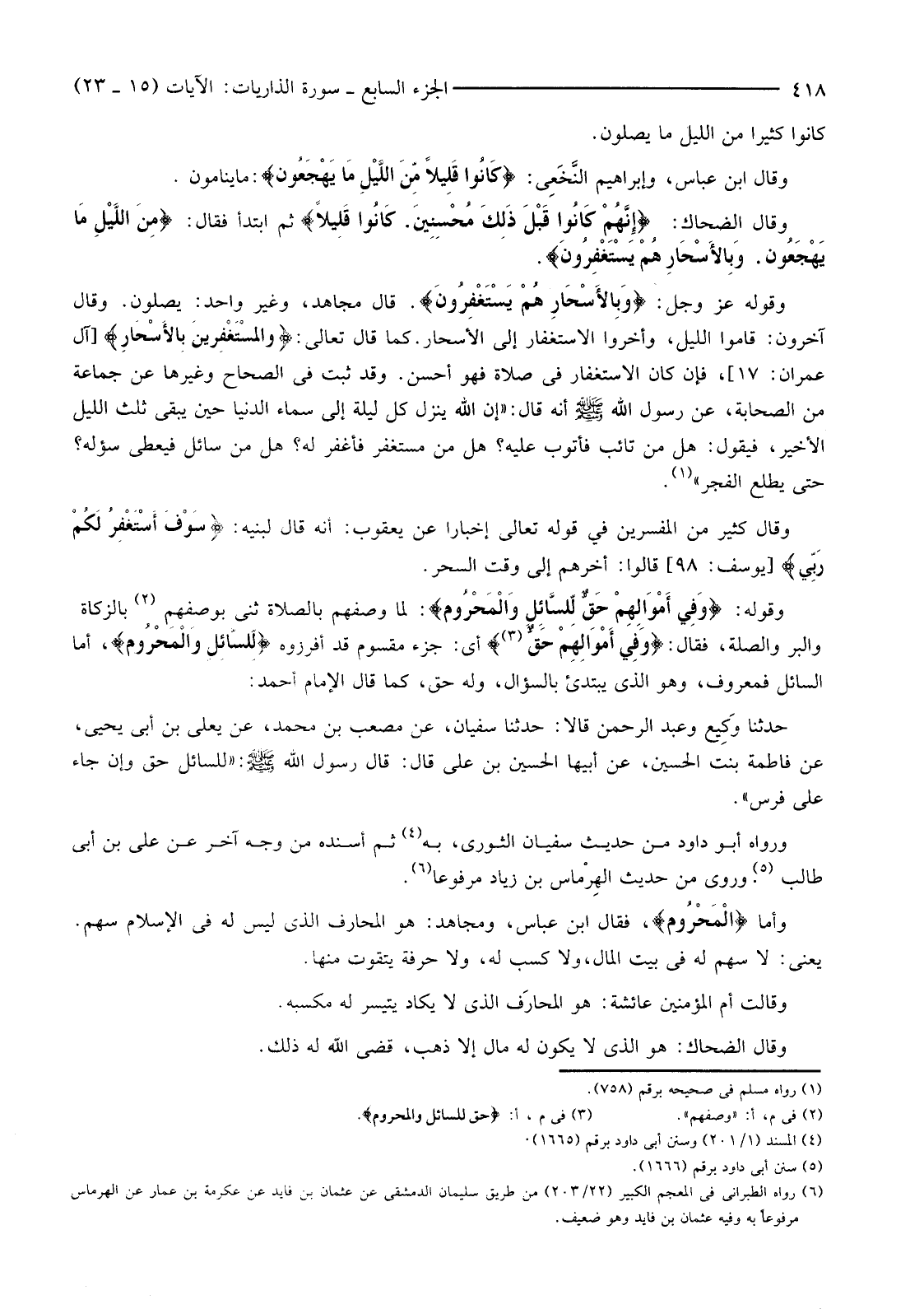 وَقَوْلُهُ عَزَّ وَجَلَّ: {وَبِالأسْحَارِ هُمْ يَسْتَغْفِرُونَ} . قَالَ مُجَاهِدٌ، وَغَيْرُ وَاحِدٍ: يُصَلُّونَ. وَقَالَ آخَرُونَ: قَامُوا اللَّيْلَ، وَأَخَّرُوا الِاسْتِغْفَارَ إِلَى الْأَسْحَارِ. كَمَا قَالَ تَعَالَى: {وَالْمُسْتَغْفِرِينَ بِالأسْحَارِ} [آلِ عِمْرَانَ: 17] ، فَإِنْ كَانَ الِاسْتِغْفَارُ فِي صَلَاةٍ فَهُوَ أَحْسَنُ. وَقَدْ ثَبَتَ فِي الصِّحَاحِ وَغَيْرِهَا عَنْ جَمَاعَةٍ مِنَ الصَّحَابَةِ، عَنْ رَسُولِ اللَّهِ صَلَّى اللَّهُ عَلَيْهِ وَسَلَّمَ أَنَّهُ قَالَ: "إِنَّ اللَّهَ يَنْزِلُ كُلِّ لَيْلَةٍ إِلَى سَمَاءِ الدُّنْيَا حِينَ يَبْقَى ثُلُثُ اللَّيْلِ الْأَخِيرِ، فَيَقُولُ: هَلْ مِنْ تَائِبٍ فَأَتُوبَ عَلَيْهِ؟ هَلْ مِنْ مُسْتَغْفِرٍ فَأَغْفِرَ لَهُ؟ هَلْ مِنْ سَائِلٍ فَيُعْطَى سُؤْلَهُ؟ حَتَّى يَطْلُعَ الْفَجْرُ" (1) .