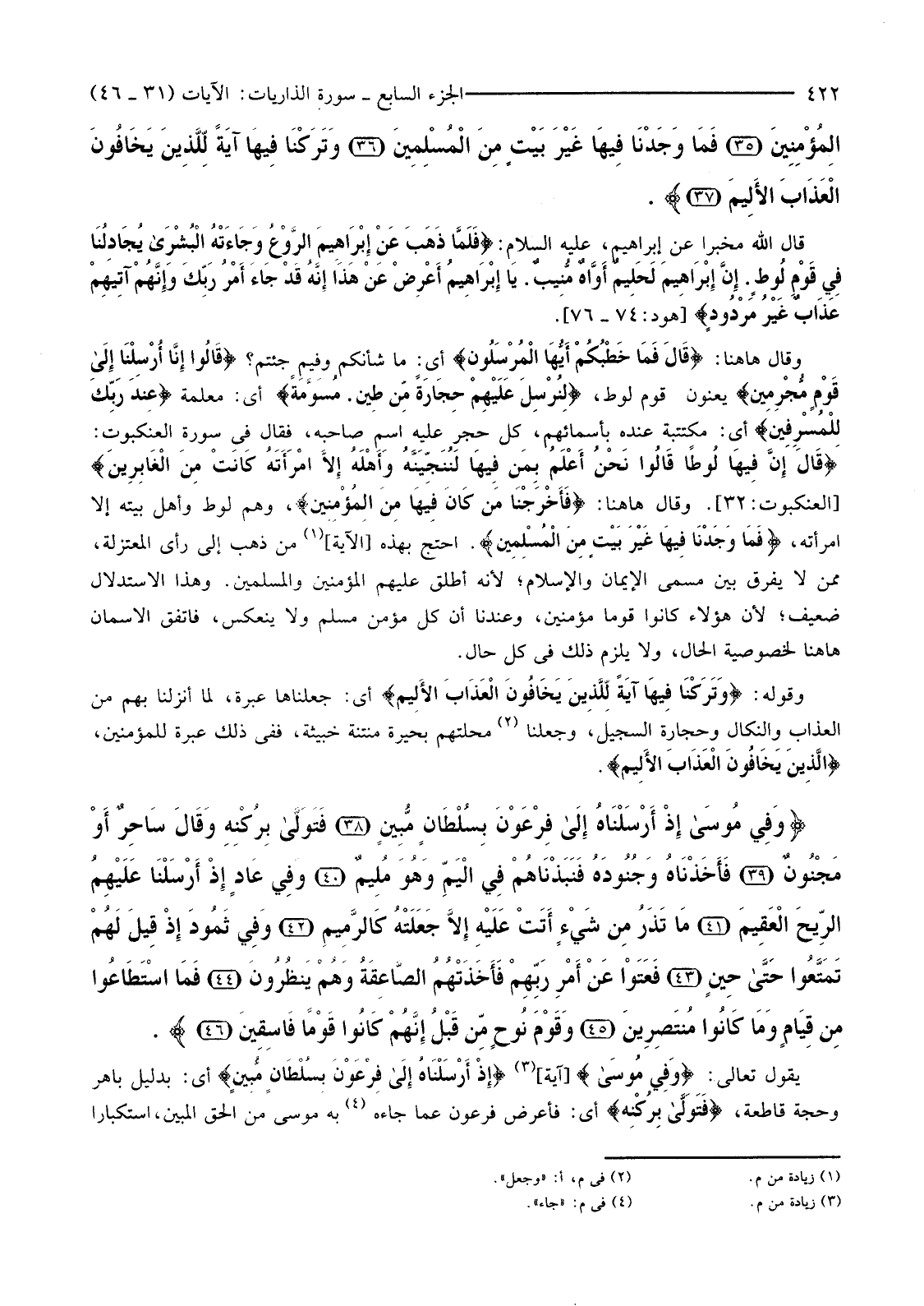 {وَفِي مُوسَى إِذْ أَرْسَلْنَاهُ إِلَى فِرْعَوْنَ بِسُلْطَانٍ مُبِينٍ (38) فَتَوَلَّى بِرُكْنِهِ وَقَالَ سَاحِرٌ أَوْ مَجْنُونٌ (39) فَأَخَذْنَاهُ وَجُنُودَهُ فَنَبَذْنَاهُمْ فِي الْيَمِّ وَهُوَ مُلِيمٌ (40) وَفِي عَادٍ إِذْ أَرْسَلْنَا عَلَيْهِمُ الرِّيحَ الْعَقِيمَ (41) مَا تَذَرُ مِنْ شَيْءٍ أَتَتْ عَلَيْهِ إِلا جَعَلَتْهُ كَالرَّمِيمِ (42) وَفِي ثَمُودَ إِذْ قِيلَ لَهُمْ تَمَتَّعُوا حَتَّى حِينٍ (43) فَعَتَوْا عَنْ أَمْرِ رَبِّهِمْ فَأَخَذَتْهُمُ الصَّاعِقَةُ وَهُمْ يَنْظُرُونَ (44) فَمَا اسْتَطَاعُوا مِنْ قِيَامٍ وَمَا كَانُوا مُنْتَصِرِينَ (45) وَقَوْمَ نُوحٍ مِنْ قَبْلُ إِنَّهُمْ كَانُوا قَوْمًا فَاسِقِينَ (46) }