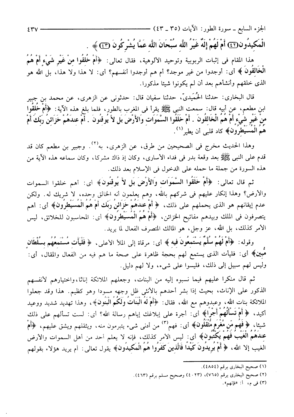 {أَمْ خُلِقُوا مِنْ غَيْرِ شَيْءٍ أَمْ هُمُ الْخَالِقُونَ (35) أَمْ خَلَقُوا السَّمَوَاتِ وَالأرْضَ بَل لَا يُوقِنُونَ (36) أَمْ عِنْدَهُمْ خَزَائِنُ رَبِّكَ أَمْ هُمُ الْمُسَيْطِرُونَ (37) أَمْ لَهُمْ سُلَّمٌ يَسْتَمِعُونَ فِيهِ فَلْيَأْتِ مُسْتَمِعُهُمْ بِسُلْطَانٍ مُبِينٍ (38) أَمْ لَهُ الْبَنَاتُ وَلَكُمُ الْبَنُونَ (39) أَمْ تَسْأَلُهُمْ أَجْرًا فَهُمْ مِنْ مَغْرَمٍ مُثْقَلُونَ (40) أَمْ عِنْدَهُمُ الْغَيْبُ فَهُمْ يَكْتُبُونَ (41) أَمْ يُرِيدُونَ كَيْدًا فَالَّذِينَ كَفَرُوا هُمُ الْمَكِيدُونَ (42) أَمْ لَهُمْ إِلَهٌ غَيْرُ اللَّهِ سُبْحَانَ اللَّهِ عَمَّا يُشْرِكُونَ (43) }