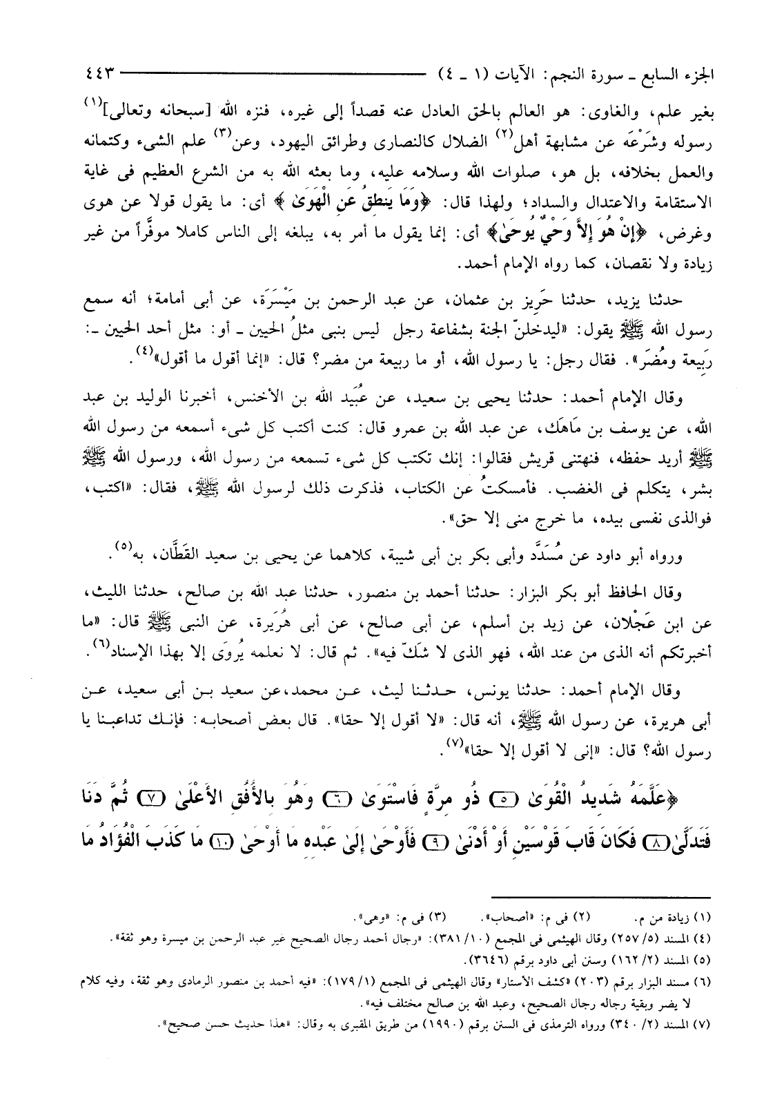 بِغَيْرِ عِلْمٍ، وَالْغَاوِي: هُوَ الْعَالِمُ بِالْحَقِّ الْعَادِلُ عَنْهُ قَصْدًا إِلَى غَيْرِهِ، فَنَزَّهَ اللَّهُ [سُبْحَانَهُ وَتَعَالَى] (1) رَسُولَهُ وشَرْعَه عَنْ مُشَابَهَةِ أَهْلِ (2) الضَّلَالِ كَالنَّصَارَى وَطَرَائِقِ الْيَهُودِ، وَعَنْ (3) عِلْمِ الشَّيْءِ وَكِتْمَانِهِ وَالْعَمَلِ بِخِلَافِهِ، بَلْ هُوَ صَلَوَاتُ اللَّهِ وَسَلَامُهُ عَلَيْهِ، وَمَا بَعَثَهُ اللَّهُ بِهِ مِنَ الشَّرْعِ الْعَظِيمِ فِي غَايَةِ الِاسْتِقَامَةِ وَالِاعْتِدَالِ وَالسَّدَادِ؛ وَلِهَذَا قَالَ: {وَمَا يَنْطِقُ عَنِ الْهَوَى} أَيْ: مَا يَقُولُ قَوْلًا عَنْ هَوًى وَغَرَضٍ، {إِنْ هُوَ إِلا وَحْيٌ يُوحَى} أَيْ: إِنَّمَا يَقُولُ مَا أُمِرَ بِهِ، يُبَلِّغُهُ إِلَى النَّاسِ كَامِلًا موفَّرًا مِنْ غَيْرِ زِيَادَةٍ وَلَا نُقْصَانٍ، كَمَا رَوَاهُ الْإِمَامُ أَحْمَدُ.