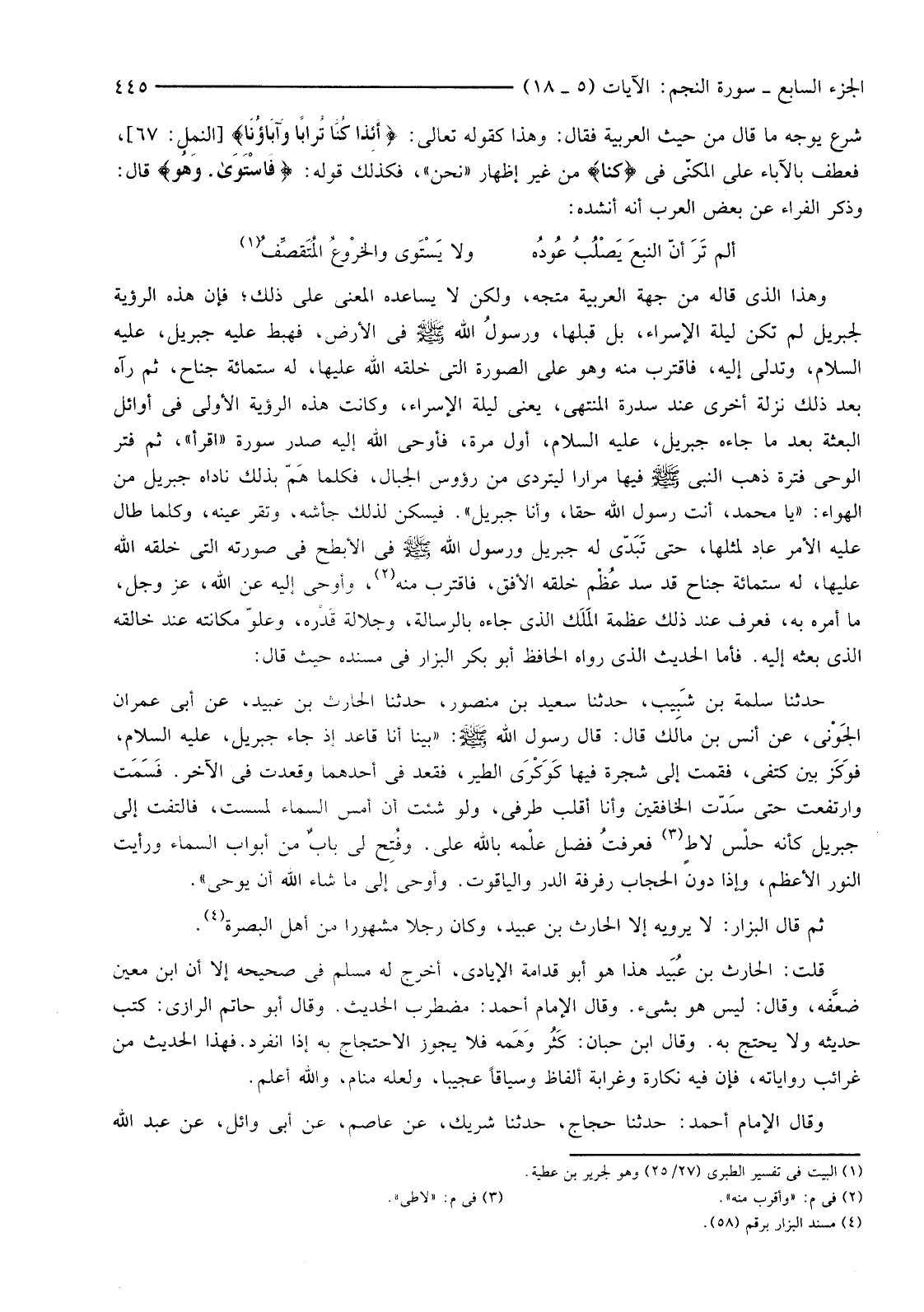 وَهَذَا الَّذِي قَالَهُ مِنْ جِهَةِ الْعَرَبِيَّةِ مُتَّجِهٌ، وَلَكِنْ لَا يُسَاعِدُهُ الْمَعْنَى عَلَى ذَلِكَ؛ فَإِنَّ هَذِهِ الرُّؤْيَةَ لِجِبْرِيلَ لَمْ تَكُنْ لَيْلَةَ الْإِسْرَاءِ، بَلْ قَبْلَهَا، ورسولُ اللَّهِ صَلَّى اللَّهُ عَلَيْهِ وَسَلَّمَ فِي الْأَرْضِ، فَهَبَطَ عَلَيْهِ جِبْرِيلُ، عَلَيْهِ السَّلَامُ، وَتَدَلَّى إِلَيْهِ، فَاقْتَرَبَ مِنْهُ وَهُوَ عَلَى الصُّورَةِ الَّتِي خَلَقَهُ اللَّهُ عَلَيْهَا، لَهُ سِتُّمِائَةِ جَنَاحٍ، ثُمَّ رَآهُ بَعْدَ ذَلِكَ نَزْلَةً أُخْرَى عِنْدَ سِدْرَةِ الْمُنْتَهَى، يَعْنِي لَيْلَةَ الْإِسْرَاءِ، وَكَانَتْ هَذِهِ الرُّؤْيَةُ الْأُولَى فِي أَوَائِلِ الْبَعْثَةِ بَعْدَ مَا جَاءَهُ جِبْرِيلُ، عَلَيْهِ السَّلَامُ، أَوَّلَ مَرَّةٍ، فَأَوْحَى اللَّهُ إِلَيْهِ صَدْرَ سُورَةِ "اقْرَأْ"، ثُمَّ فَتَرَ الْوَحْيُ فَتْرَةً ذَهَبَ النَّبِيُّ صَلَّى اللَّهُ عَلَيْهِ وسلم فيها مرارا ليتردى من رؤوس الْجِبَالِ، فَكُلَّمَا هَمّ بِذَلِكَ نَادَاهُ جِبْرِيلُ مِنَ الْهَوَاءِ: "يَا مُحَمَّدُ، أَنْتَ رَسُولُ اللَّهِ حَقًّا، وَأَنَا جِبْرِيلُ". فَيَسْكُنُ لِذَلِكَ جَأْشُهُ، وَتَقَرُّ عَيْنُهُ، وَكُلَّمَا طَالَ عَلَيْهِ الْأَمْرُ عَادَ لِمِثْلِهَا، حَتَّى تَبَدّى لَهُ جِبْرِيلُ وَرَسُولُ اللَّهِ صَلَّى اللَّهُ عَلَيْهِ وَسَلَّمَ فِي الْأَبْطَحِ فِي صُورَتِهِ الَّتِي خَلَقَهُ اللَّهُ عَلَيْهَا، لَهُ سِتُّمِائَةِ جَنَاحٍ قَدْ سَدَّ عُظْم خَلْقِهِ الْأُفُقَ، فَاقْتَرَبَ مِنْهُ (2) وَأَوْحَى إِلَيْهِ عَنِ اللَّهِ، عَزَّ وَجَلَّ، مَا أَمَرَهُ بِهِ، فَعَرَفَ عِنْدَ ذَلِكَ عَظَمَةَ المَلَك الَّذِي جَاءَهُ بِالرِّسَالَةِ، وَجَلَالَةَ قَدْره، وَعُلُوَّ مَكَانَتِهِ عِنْدَ خَالِقِهِ الَّذِي بَعَثَهُ إِلَيْهِ. فَأَمَّا الْحَدِيثُ الَّذِي رَوَاهُ الْحَافِظُ أَبُو بَكْرٍ الْبَزَّارُ فِي مُسْنَدِهِ حَيْثُ قَالَ: