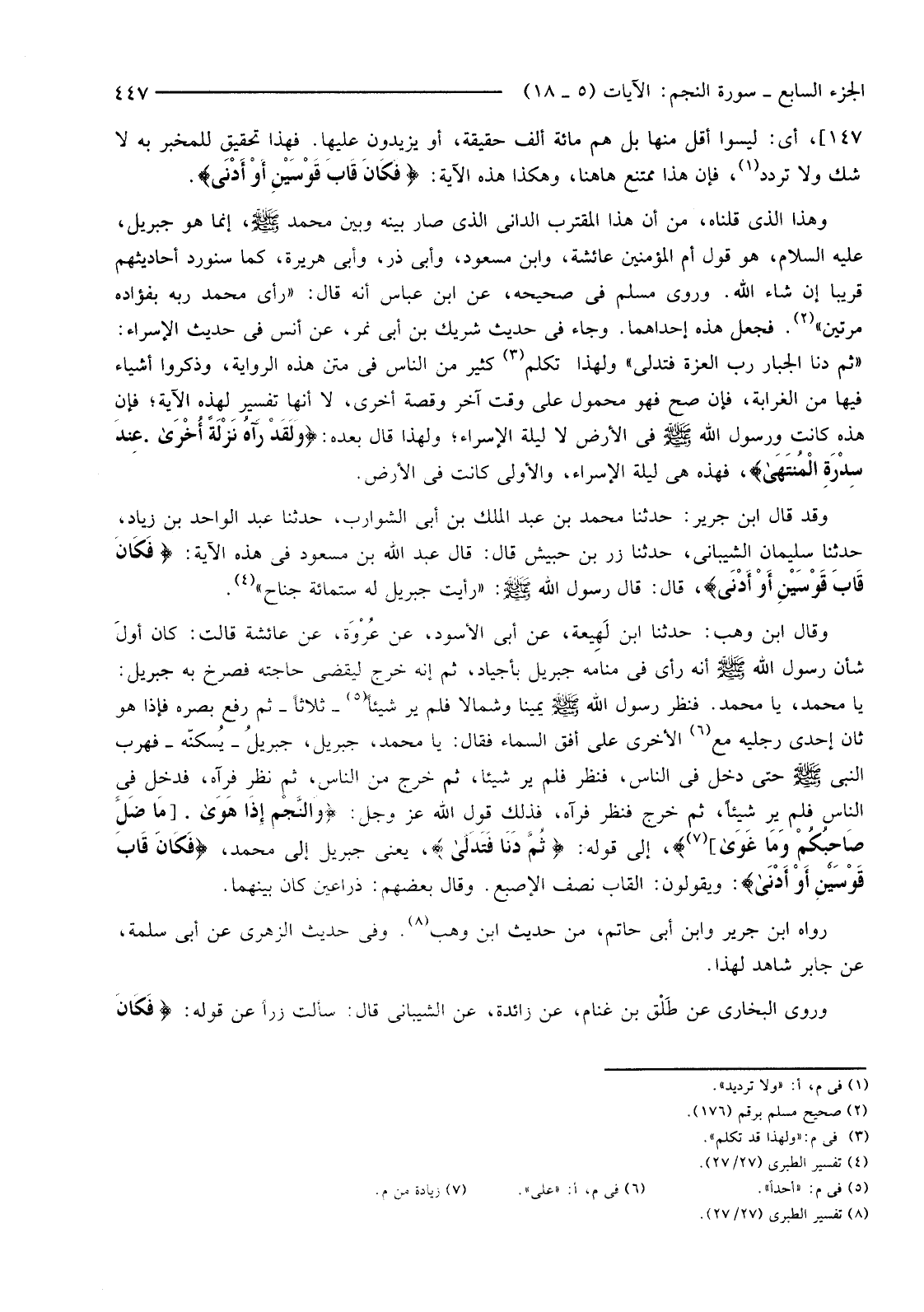 وَهَذَا الَّذِي قُلْنَاهُ مِنْ أَنَّ هَذَا الْمُقْتَرِبَ الدَّانِيَ الَّذِي صَارَ بَيْنَهُ وَبَيْنَ مُحَمَّدٍ صَلَّى اللَّهُ عَلَيْهِ وَسَلَّمَ، إِنَّمَا هُوَ جِبْرِيلُ، عَلَيْهِ السَّلَامُ، هُوَ قَوْلُ أُمِّ الْمُؤْمِنِينَ عَائِشَةَ، وَابْنِ مَسْعُودٍ، وَأَبِي ذَرٍّ، وَأَبِي هُرَيْرَةَ، كَمَا سَنُورِدُ أَحَادِيثَهُمْ قَرِيبًا إِنْ شَاءَ اللَّهُ. وَرَوَى مُسْلِمٌ فِي صَحِيحِهِ، عَنِ ابْنِ عَبَّاسٍ أَنَّهُ قَالَ: "رَأَى مُحَمَّدٌ رَبَّهُ بِفُؤَادِهِ مَرَّتَيْنِ" (2) . فَجَعَلَ هَذِهِ إِحْدَاهُمَا. وَجَاءَ فِي حَدِيثِ شَرِيكِ بْنِ أَبِي نَمِرٍ، عَنْ أَنَسٍ فِي حَدِيثِ الْإِسْرَاءِ: "ثُمَّ دَنَا الْجَبَّارُ رَبُّ الْعِزَّةِ فَتَدَلَّى" وَلِهَذَا تَكَلَّمَ (3) كَثِيرٌ مِنَ النَّاسِ فِي مَتْنِ هَذِهِ الرِّوَايَةِ، وَذَكَرُوا أَشْيَاءَ فِيهَا مِنَ الْغَرَابَةِ، فَإِنْ صَحَّ فَهُوَ مَحْمُولٌ عَلَى وَقْتٍ آخَرَ وَقِصَّةٍ أُخْرَى، لَا أَنَّهَا تَفْسِيرٌ لِهَذِهِ الْآيَةِ؛ فَإِنَّ هَذِهِ كَانَتْ وَرَسُولُ اللَّهِ صَلَّى اللَّهُ عَلَيْهِ وَسَلَّمَ فِي الْأَرْضِ لَا لَيْلَةَ الْإِسْرَاءِ؛ وَلِهَذَا قَالَ بَعْدَهُ: {وَلَقَدْ رَآهُ نزلَةً أُخْرَى. عِنْدَ سِدْرَةِ الْمُنْتَهَى} ، فَهَذِهِ هِيَ لَيْلَةُ الْإِسْرَاءِ وَالْأُولَى كَانَتْ فِي الْأَرْضِ.