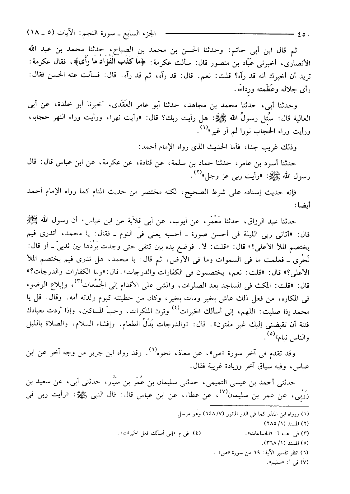 ثُمَّ قَالَ ابْنُ أَبِي حَاتِمٍ: وَحَدَّثَنَا الْحَسَنُ بْنُ مُحَمَّدِ بْنِ الصَّبَّاحِ، حَدَّثَنَا مُحَمَّدُ بْنُ عَبْدِ اللَّهِ الْأَنْصَارِيُّ، أَخْبَرَنِي عَبَّاد بْنُ مَنْصُورٍ قَالَ: سَأَلْتُ عِكْرِمَةَ: {مَا كَذَبَ الْفُؤَادُ مَا رَأَى} ، فَقَالَ عِكْرِمَةُ: تُرِيدُ أَنْ أُخْبِرَكَ أَنَّهُ قَدْ رَآهُ؟ قُلْتُ: نَعَمْ. قَالَ: قَدْ رَآهُ، ثُمَّ قَدْ رَآهُ. قَالَ: فَسَأَلْتُ عَنْهُ الْحَسَنَ فَقَالَ: رَأَى جَلَالَهُ وعَظَمته ورِداءَه.