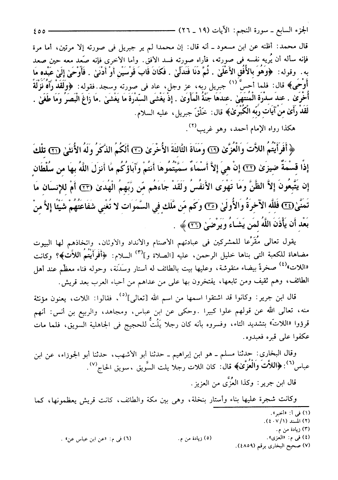 {أَفَرَأَيْتُمُ اللاتَ وَالْعُزَّى (19) وَمَنَاةَ الثَّالِثَةَ الأخْرَى (20) أَلَكُمُ الذَّكَرُ وَلَهُ الأنْثَى (21) تِلْكَ إِذًا قِسْمَةٌ ضِيزَى (22) إِنْ هِيَ إِلا أَسْمَاءٌ سَمَّيْتُمُوهَا أَنْتُمْ وَآبَاؤُكُمْ مَا أَنزلَ اللَّهُ بِهَا مِنْ سُلْطَانٍ إِنْ يَتَّبِعُونَ إِلا الظَّنَّ وَمَا تَهْوَى الأنْفُسُ وَلَقَدْ جَاءَهُمْ مِنْ رَبِّهِمُ الْهُدَى (23) أَمْ لِلإنْسَانِ مَا تَمَنَّى (24) فَلِلَّهِ الآخِرَةُ وَالأولَى (25) وَكَمْ مِنْ مَلَكٍ فِي السَّمَوَاتِ لَا تُغْنِي شَفَاعَتُهُمْ شَيْئًا إِلا مِنْ بَعْدِ أَنْ يَأْذَنَ اللَّهُ لِمَنْ يَشَاءُ وَيَرْضَى (26) }