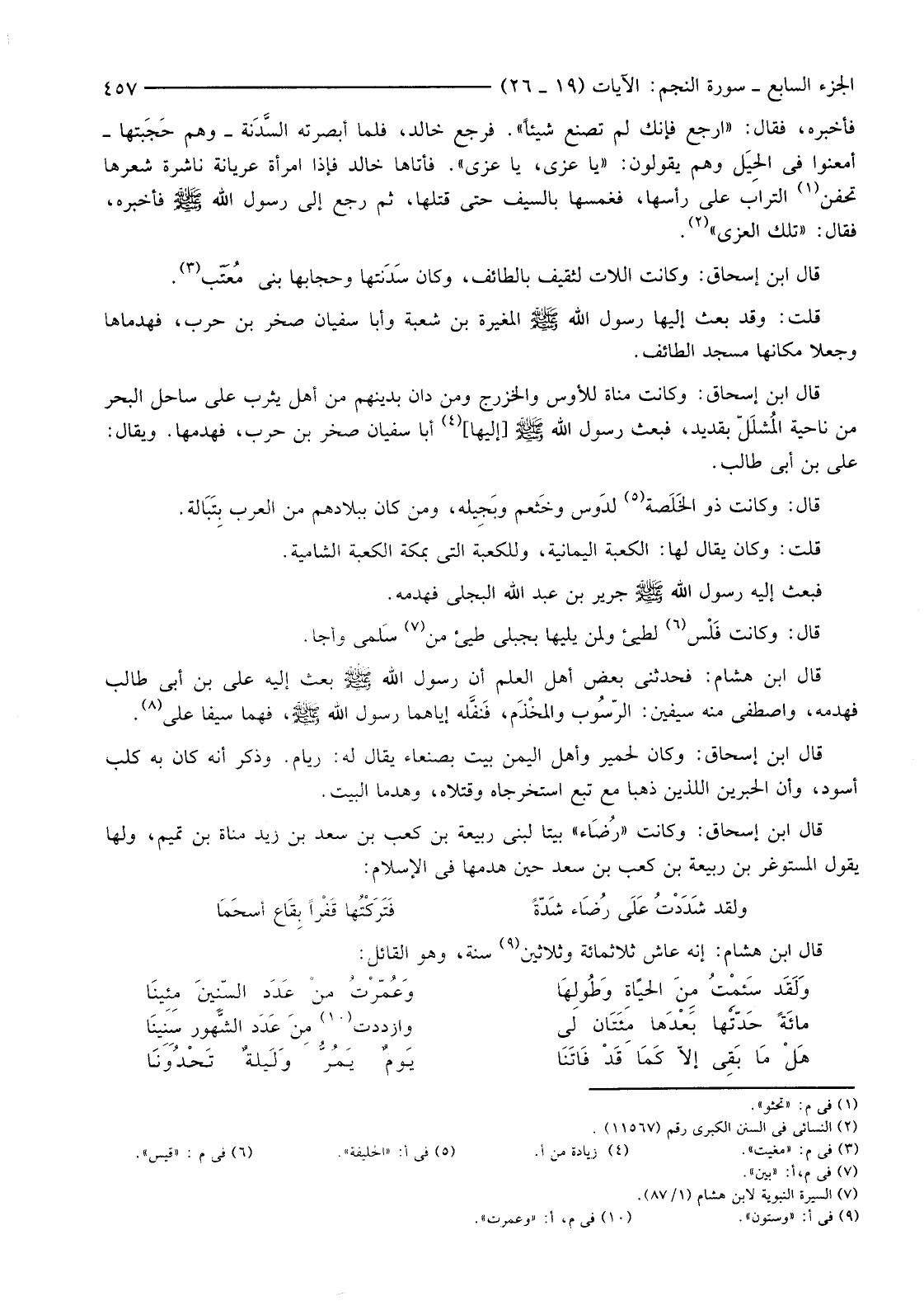 قَالَ ابْنُ إِسْحَاقَ: وَكَانَتْ مَنَاةُ لِلْأَوْسِ وَالْخَزْرَجِ وَمَنْ دَانَ بِدِينِهِمْ مِنْ أَهْلِ يَثْرِبَ عَلَى سَاحِلِ الْبَحْرِ مِنْ نَاحِيَةِ المُشَلّل بِقُدَيْدٍ، فَبَعَثَ رَسُولُ اللَّهِ صَلَّى اللَّهُ عَلَيْهِ وَسَلَّمَ [إِلَيْهَا] (4) أَبَا سُفْيَانَ صَخْرَ بْنَ حَرْبٍ، فَهَدَمَهَا. وَيُقَالُ: عَلِيُّ بْنُ أَبِي طَالِبٍ.