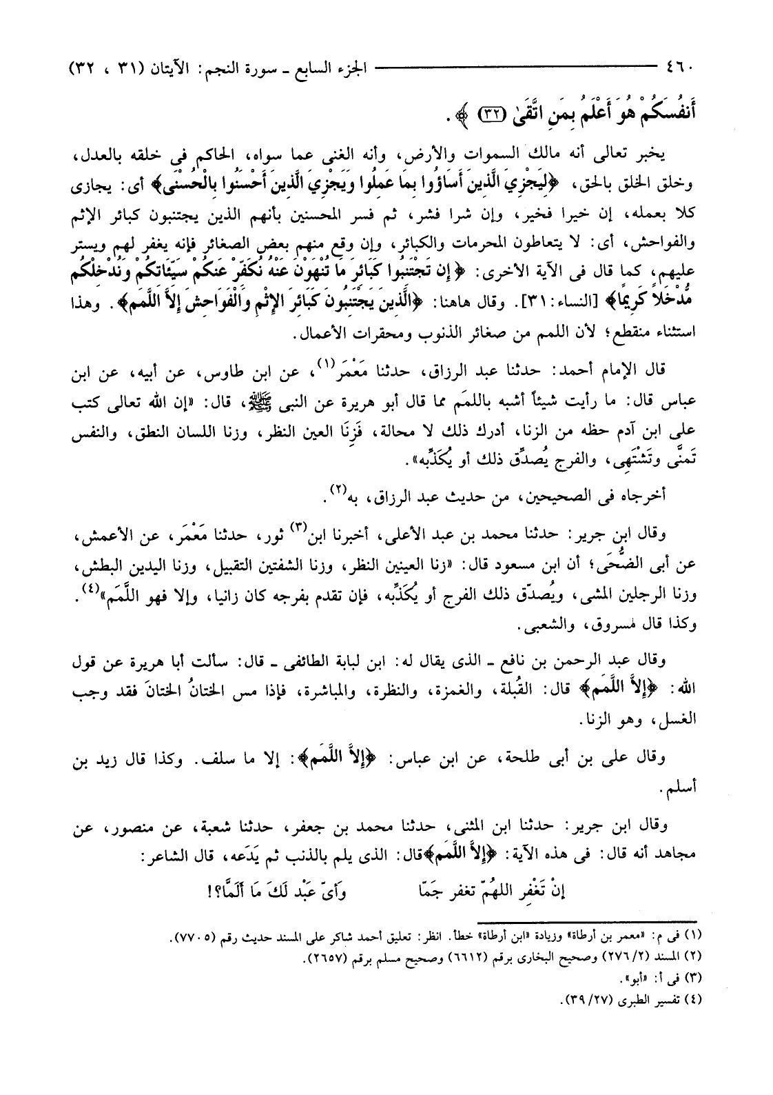 ثُمَّ فَسَّرَ الْمُحْسِنِينَ بِأَنَّهُمُ الَّذِينَ يَجْتَنِبُونَ كَبَائِرَ الْإِثْمِ وَالْفَوَاحِشَ، أَيْ: لَا يَتَعَاطَوْنَ الْمُحَرَّمَاتِ وَالْكَبَائِرَ، وَإِنْ وَقَعَ مِنْهُمْ بَعْضُ الصَّغَائِرِ فَإِنَّهُ يَغْفِرُ لَهُمْ وَيَسْتُرُ عَلَيْهِمْ، كَمَا قَالَ فِي الْآيَةِ الْأُخْرَى: {إِنْ تَجْتَنِبُوا كَبَائِرَ مَا تُنْهَوْنَ عَنْهُ نُكَفِّرْ عَنْكُمْ سَيِّئَاتِكُمْ وَنُدْخِلْكُمْ مُدْخَلا كَرِيمًا} [النِّسَاءِ: 31] . وَقَالَ هَاهُنَا: {الَّذِينَ يَجْتَنِبُونَ كَبَائِرَ الإثْمِ وَالْفَوَاحِشَ إِلا اللَّمَمَ} . وَهَذَا اسْتِثْنَاءٌ مُنْقَطِعٌ؛ لِأَنَّ اللَّمَمَ مِنْ صَغَائِرِ الذُّنُوبِ وَمُحَقَّرَاتِ الْأَعْمَالِ.