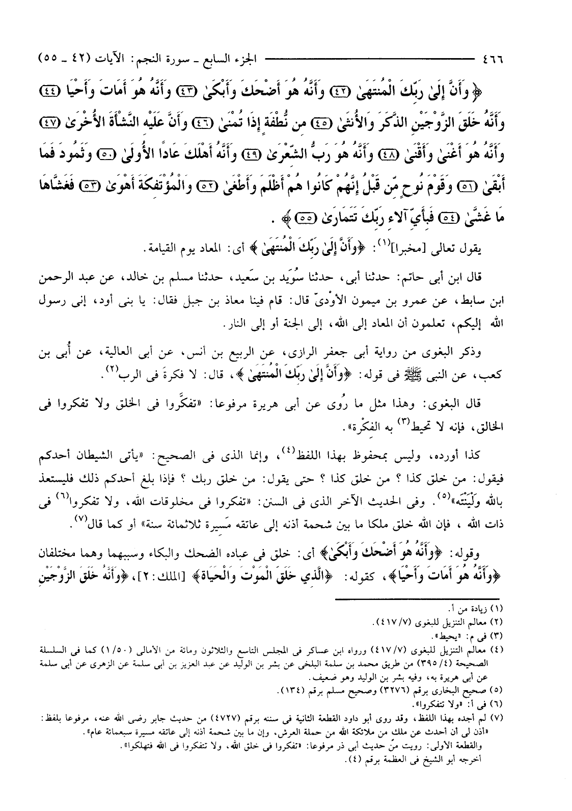 وَذَكَرَ الْبَغَوِيُّ مِنْ رِوَايَةِ أَبِي جَعْفَرٍ الرَّازِيُّ، عَنِ الرَّبِيعِ بْنِ أَنَسٍ، عَنْ أَبِي الْعَالِيَةِ، عَنْ أُبَيِّ بْنِ كَعْبٍ، عَنِ النَّبِيِّ صَلَّى اللَّهُ عَلَيْهِ وَسَلَّمَ فِي قَوْلِهِ: {وَأَنَّ إِلَى رَبِّكَ الْمُنْتَهَى} ، قَالَ: لَا فكرةَ فِي الرَّبِّ (2) .