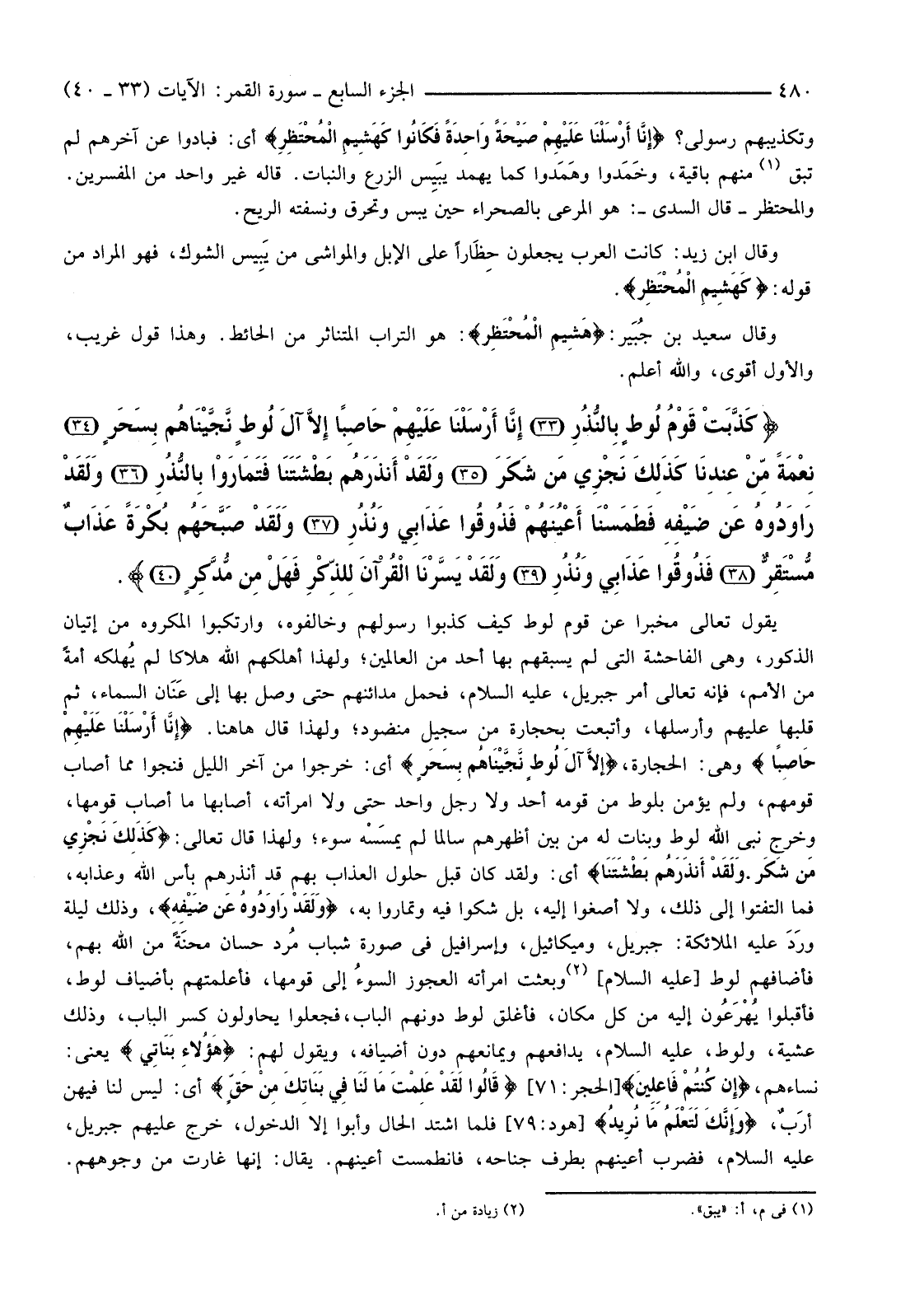 {كَذَّبَتْ قَوْمُ لُوطٍ بِالنُّذُرِ (33) إِنَّا أَرْسَلْنَا عَلَيْهِمْ حَاصِبًا إِلا آلَ لُوطٍ نَجَّيْنَاهُمْ بِسَحَرٍ (34) نِعْمَةً مِنْ عِنْدِنَا كَذَلِكَ نَجْزِي مَنْ شَكَرَ (35) وَلَقَدْ أَنْذَرَهُمْ بَطْشَتَنَا فَتَمَارَوْا بِالنُّذُرِ (36) وَلَقَدْ رَاوَدُوهُ عَنْ ضَيْفِهِ فَطَمَسْنَا أَعْيُنَهُمْ فَذُوقُوا عَذَابِي وَنُذُرِ (37) وَلَقَدْ صَبَّحَهُمْ بُكْرَةً عَذَابٌ مُسْتَقِرٌّ (38) فَذُوقُوا عَذَابِي وَنُذُرِ (39) وَلَقَدْ يَسَّرْنَا الْقُرْآنَ لِلذِّكْرِ فَهَلْ مِنْ مُدَّكِرٍ (40) } .
