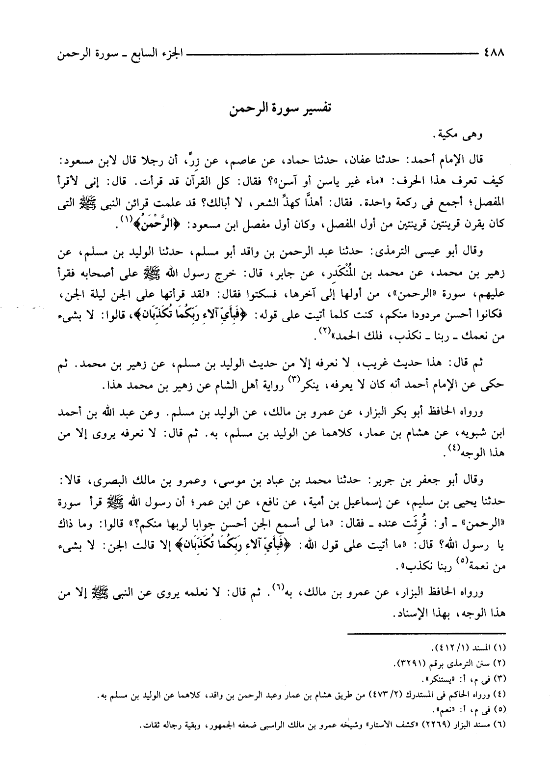وَقَالَ أَبُو عِيسَى التِّرْمِذِيُّ: حَدَّثَنَا عَبْدُ الرَّحْمَنِ بْنُ وَاقِدٍ أَبُو مُسْلِمٍ، حَدَّثَنَا الوليد بن مسلم، عن زهير بن محمد، عَنْ مُحَمَّدِ بْنِ المُنْكَدِر، عَنْ جَابِرٍ قَالَ: خَرَجَ رَسُولُ اللَّهِ صَلَّى اللَّهُ عَلَيْهِ وَسَلَّمَ عَلَى أَصْحَابِهِ فَقَرَأَ عَلَيْهِمْ سُورَةَ "الرَّحْمَنِ" مِنْ أَوَّلِهَا إِلَى آخِرِهَا، فَسَكَتُوا فَقَالَ: "لَقَدْ قَرَأْتُهَا عَلَى الْجِنِّ لَيْلَةَ الْجِنِّ، فَكَانُوا أَحْسَنَ مَرْدُودًا مِنْكُمْ، كُنْتُ كُلَّمَا أَتَيْتُ عَلَى قَوْلِهِ: {فَبِأَيِّ آلاءِ رَبِّكُمَا تُكَذِّبَانِ} ، قَالُوا: لَا بِشَيْءٍ مِنْ نِعَمِكَ -رَبَّنَا-نُكَذِّبُ، فَلَكَ الْحَمْدُ" (2) .