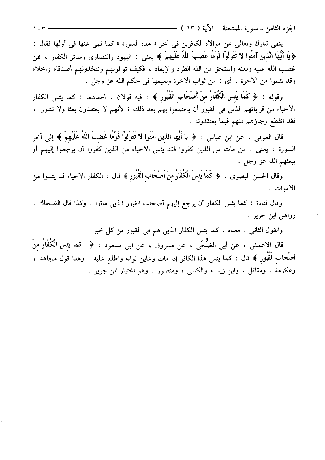 قَالَ الْعَوْفِيُّ، عَنِ ابْنِ عَبَّاسٍ: {يَا أَيُّهَا الَّذِينَ آمَنُوا لَا تَتَوَلَّوْا قَوْمًا غَضِبَ اللَّهُ عَلَيْهِمْ} إِلَى آخِرِ السُّورَةِ، يَعْنِي مَنْ مَاتَ مِنَ الَّذِينَ كَفَرُوا فَقَدْ يَئِسَ الْأَحْيَاءُ مِنَ الَّذِينَ كَفَرُوا أَنْ يَرْجِعُوا إِلَيْهِمْ أَوْ يَبْعَثَهُمُ اللَّهُ عَزَّ وَجَلَّ.