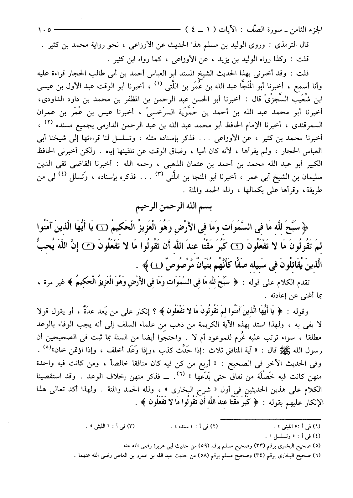 {سَبَّحَ لِلَّهِ مَا فِي السَّمَاوَاتِ وَمَا فِي الأرْضِ وَهُوَ الْعَزِيزُ الْحَكِيمُ (1) يَا أَيُّهَا الَّذِينَ آمَنُوا لِمَ تَقُولُونَ مَا لَا تَفْعَلُونَ (2) كَبُرَ مَقْتًا عِنْدَ اللَّهِ أَنْ تَقُولُوا مَا لَا تَفْعَلُونَ (3) إِنَّ اللَّهَ يُحِبُّ الَّذِينَ يُقَاتِلُونَ فِي سَبِيلِهِ صَفًّا كَأَنَّهُمْ بُنْيَانٌ مَرْصُوصٌ (4) }