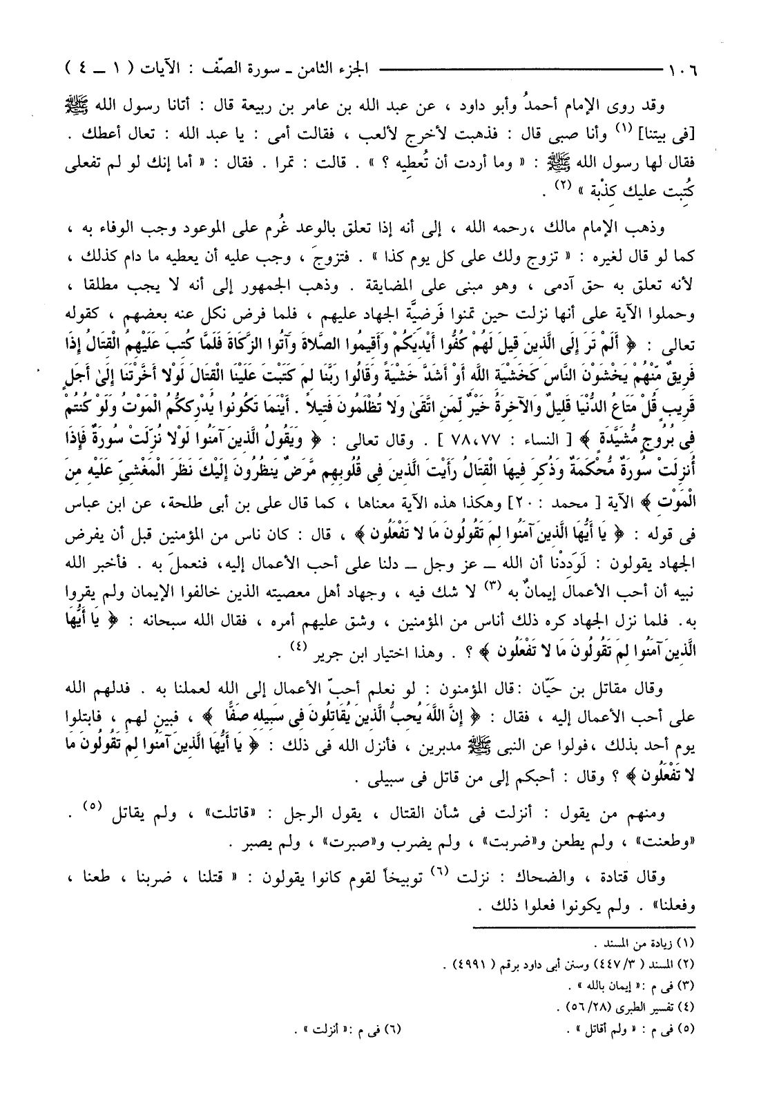 وَمِنْهُمْ مَنْ يَقُولُ: أُنْزِلَتْ فِي شَأْنِ الْقِتَالِ، يَقُولُ الرَّجُلُ: "قَاتَلْتُ"، وَلَمْ يُقَاتِلْ (5) وَطَعَنْتُ" وَلَمْ يَطْعَنْ وَ "ضَرَبْتُ"، وَلَمْ يَضْرِبْ وَ "صَبَرْتُ"، وَلَمْ يَصْبِرْ.