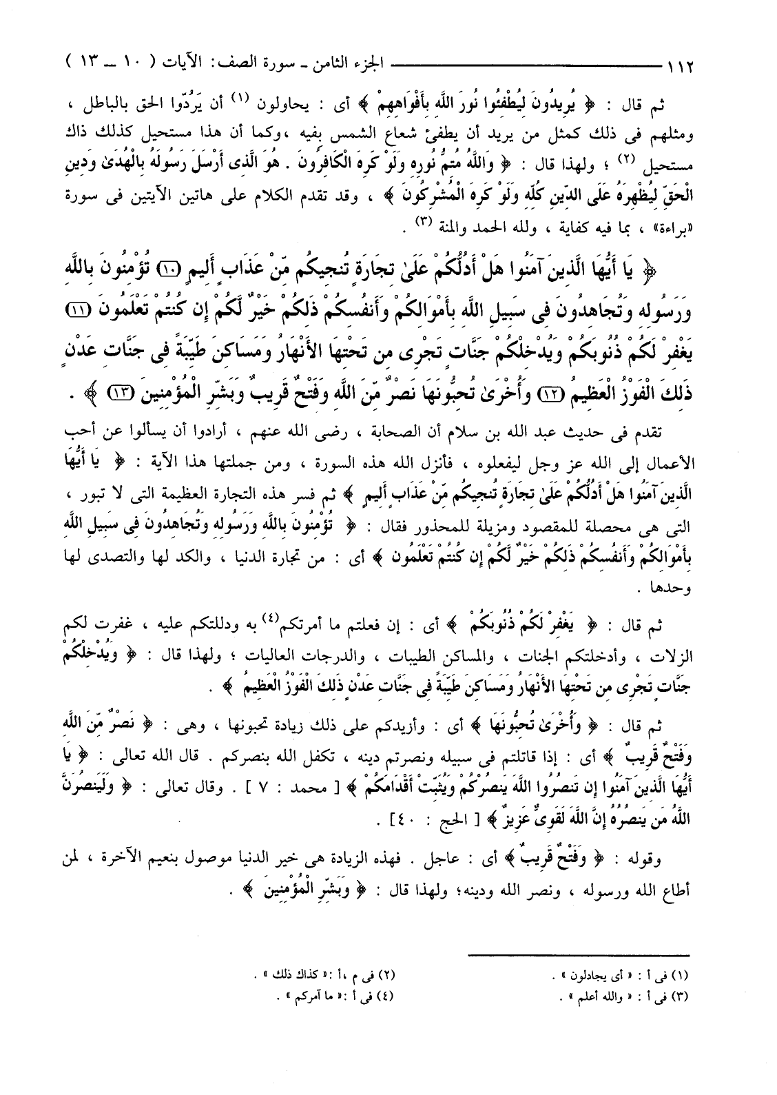 {يَا أَيُّهَا الَّذِينَ آمَنُوا هَلْ أَدُلُّكُمْ عَلَى تِجَارَةٍ تُنْجِيكُمْ مِنْ عَذَابٍ أَلِيمٍ (10) تُؤْمِنُونَ بِاللَّهِ وَرَسُولِهِ وَتُجَاهِدُونَ فِي سَبِيلِ اللَّهِ بِأَمْوَالِكُمْ وَأَنْفُسِكُمْ ذَلِكُمْ خَيْرٌ لَكُمْ إِنْ كُنْتُمْ تَعْلَمُونَ (11) يَغْفِرْ لَكُمْ ذُنُوبَكُمْ وَيُدْخِلْكُمْ جَنَّاتٍ تَجْرِي مِنْ تَحْتِهَا الأنْهَارُ وَمَسَاكِنَ طَيِّبَةً فِي جَنَّاتِ عَدْنٍ ذَلِكَ الْفَوْزُ الْعَظِيمُ (12) وَأُخْرَى تُحِبُّونَهَا نَصْرٌ مِنَ اللَّهِ وَفَتْحٌ قَرِيبٌ وَبَشِّرِ الْمُؤْمِنِينَ (13) }
