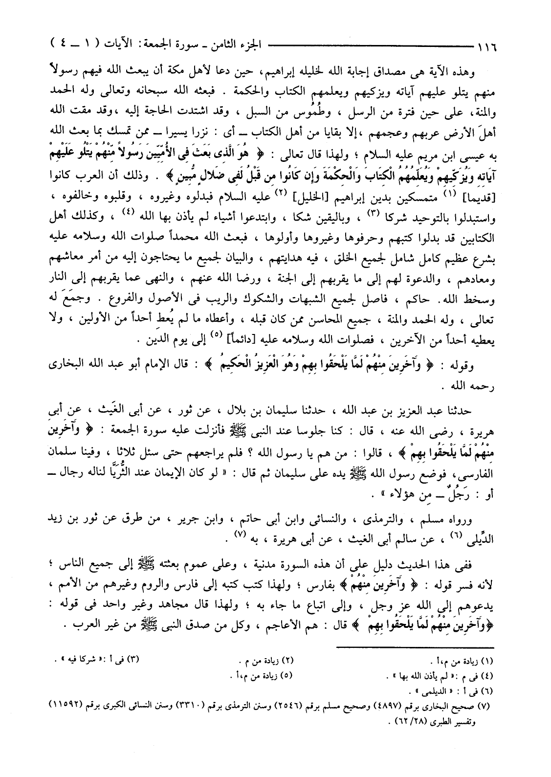 وَقَوْلُهُ: {وَآخَرِينَ مِنْهُمْ لَمَّا يَلْحَقُوا بِهِمْ وَهُوَ الْعَزِيزُ الْحَكِيمُ} قَالَ الْإِمَامُ أَبُو عَبْدِ اللَّهِ الْبُخَارِيُّ رَحِمَهُ اللَّهُ.