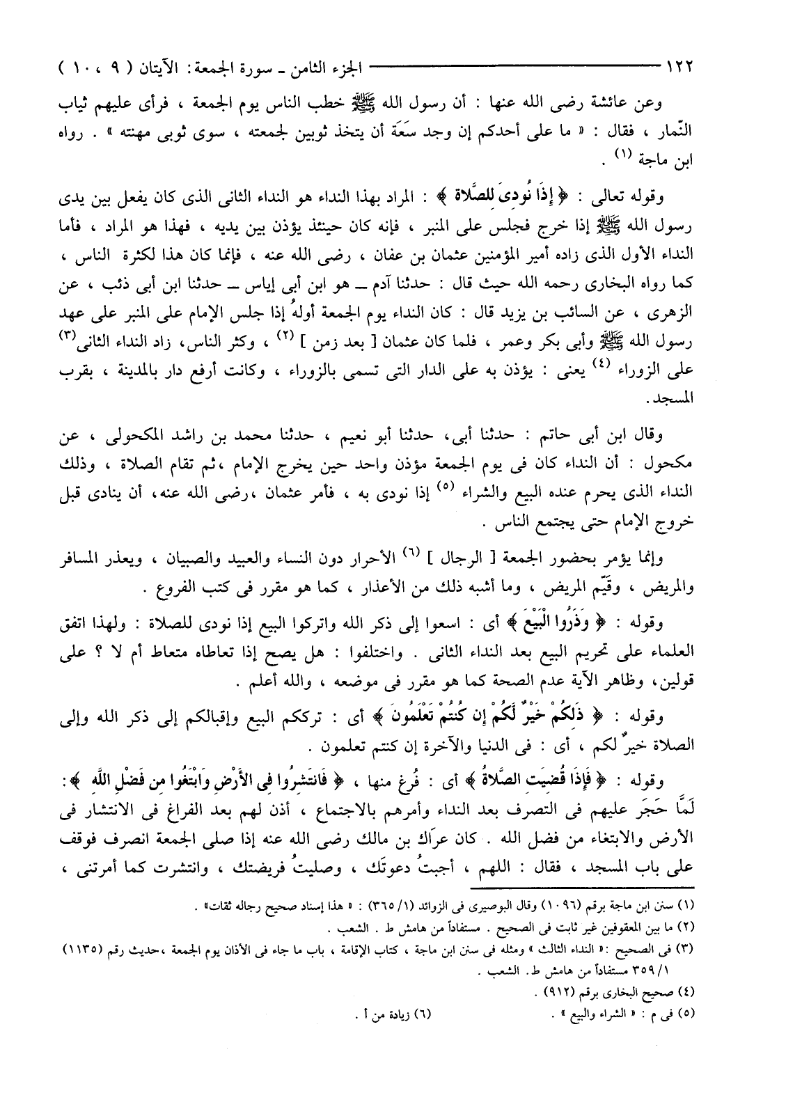 وَقَوْلُهُ تَعَالَى: {إِذَا نُودِيَ لِلصَّلاةِ} الْمُرَادُ بِهَذَا النِّدَاءِ هُوَ النِّدَاءُ الثَّانِي الَّذِي كَانَ يُفْعَلُ بَيْنَ يَدَيْ رَسُولِ اللَّهِ صَلَّى اللَّهُ عَلَيْهِ وَسَلَّمَ إِذَا خَرَجَ فَجَلَسَ عَلَى الْمِنْبَرِ، فَإِنَّهُ كَانَ حِينَئِذٍ يُؤَذَّنُ بَيْنَ يَدَيْهِ، فَهَذَا هُوَ الْمُرَادُ، فَأَمَّا النِّدَاءُ الْأَوَّلُ الَّذِي زَادَهُ أَمِيرِ الْمُؤْمِنِينَ عُثْمَانَ بْنِ عَفَّانَ، رَضِيَ اللَّهُ عَنْهُ، فَإِنَّمَا كَانَ هَذَا لِكَثْرَةِ النَّاسِ، كَمَا رَوَاهُ الْبُخَارِيُّ رَحِمَهُ اللَّهُ حَيْثُ قَالَ: حَدَّثَنَا آدَمُ -هُوَ ابْنُ أَبِي إِيَاسٍ-حَدَّثَنَا ابْنُ أَبِي ذِئْبٍ، عَنِ الزُّهْرِيِّ، عَنِ السَّائِبِ بْنِ يَزِيدَ قَالَ: كَانَ النِّدَاءُ يَوْمَ الْجُمُعَةِ أولهُ إِذَا جَلَسَ الْإِمَامُ عَلَى الْمِنْبَرِ عَلَى عَهْدِ رَسُولِ اللَّهِ صَلَّى اللَّهُ عَلَيْهِ وَسَلَّمَ وَأَبِي بَكْرٍ وَعُمَرَ، فَلَمَّا كَانَ عُثْمَانُ [بَعْدَ زَمَنٍ] (2) وَكَثُرَ النَّاسُ، زَادَ النِّدَاءَ الثَّانِيَ (3) عَلَى الزَّوْرَاءِ (4) يَعْنِي: يُؤَذَّنُ بِهِ عَلَى الدَّارِ الَّتِي تُسَمَّى بِالزَّوْرَاءِ، وَكَانَتْ أَرْفَعَ دَارٍ بِالْمَدِينَةِ، بِقُرْبِ الْمَسْجِدِ.