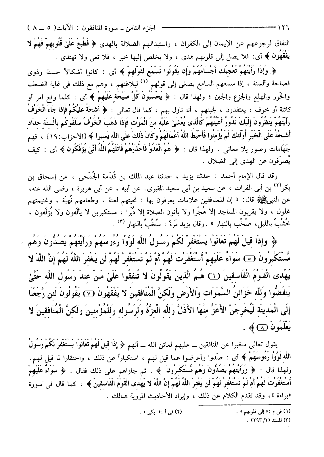 {وَإِذَا قِيلَ لَهُمْ تَعَالَوْا يَسْتَغْفِرْ لَكُمْ رَسُولُ اللَّهِ لَوَّوْا رُءُوسَهُمْ وَرَأَيْتَهُمْ يَصُدُّونَ وَهُمْ مُسْتَكْبِرُونَ (5) سَوَاءٌ عَلَيْهِمْ أَأَسْتَغْفَرْتَ لَهُمْ أَمْ لَمْ تَسْتَغْفِرْ لَهُمْ لَنْ يَغْفِرَ اللَّهُ لَهُمْ إِنَّ اللَّهَ لَا يَهْدِي الْقَوْمَ الْفَاسِقِينَ (6) هُمُ الَّذِينَ يَقُولُونَ لا تُنْفِقُوا عَلَى مَنْ عِنْدَ رَسُولِ اللَّهِ حَتَّى يَنْفَضُّوا وَلِلَّهِ خَزَائِنُ السَّمَاوَاتِ وَالأرْضِ وَلَكِنَّ الْمُنَافِقِينَ لَا يَفْقَهُونَ (7) يَقُولُونَ لَئِنْ رَجَعْنَا إِلَى الْمَدِينَةِ لَيُخْرِجَنَّ الأعَزُّ مِنْهَا الأذَلَّ وَلِلَّهِ الْعِزَّةُ وَلِرَسُولِهِ وَلِلْمُؤْمِنِينَ وَلَكِنَّ الْمُنَافِقِينَ لَا يَعْلَمُونَ (8) }