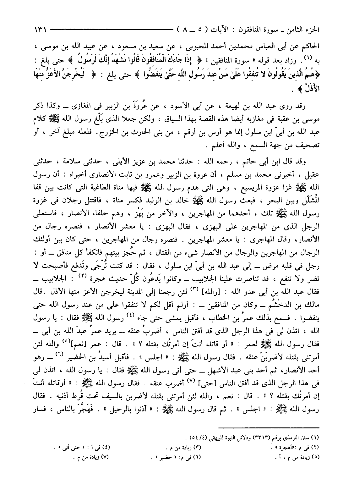 الْحَاكِمِ عَنْ أَبِي الْعَبَّاسِ مُحَمَّدِ بْنِ أَحْمَدَ الْمَحْبُوبِيِّ، عَنْ سَعِيدِ بْنِ مَسْعُودٍ، عَنْ عُبَيْدِ اللَّهِ بْنِ مُوسَى، بِهِ (1) وَزَادَ بَعْدَ قَوْلِهِ "سُورَةُ الْمُنَافِقِينَ" {إِذَا جَاءَكَ الْمُنَافِقُونَ قَالُوا نَشْهَدُ إِنَّكَ لَرَسُولُ} حَتَّى بَلَغَ: {هُمُ الَّذِينَ يَقُولُونَ لا تُنْفِقُوا عَلَى مَنْ عِنْدَ رَسُولِ اللَّهِ حَتَّى يَنْفَضُّوا} حَتَّى بَلَغَ: {لَيُخْرِجَنَّ الأعَزُّ مِنْهَا الأذَلَّ}
