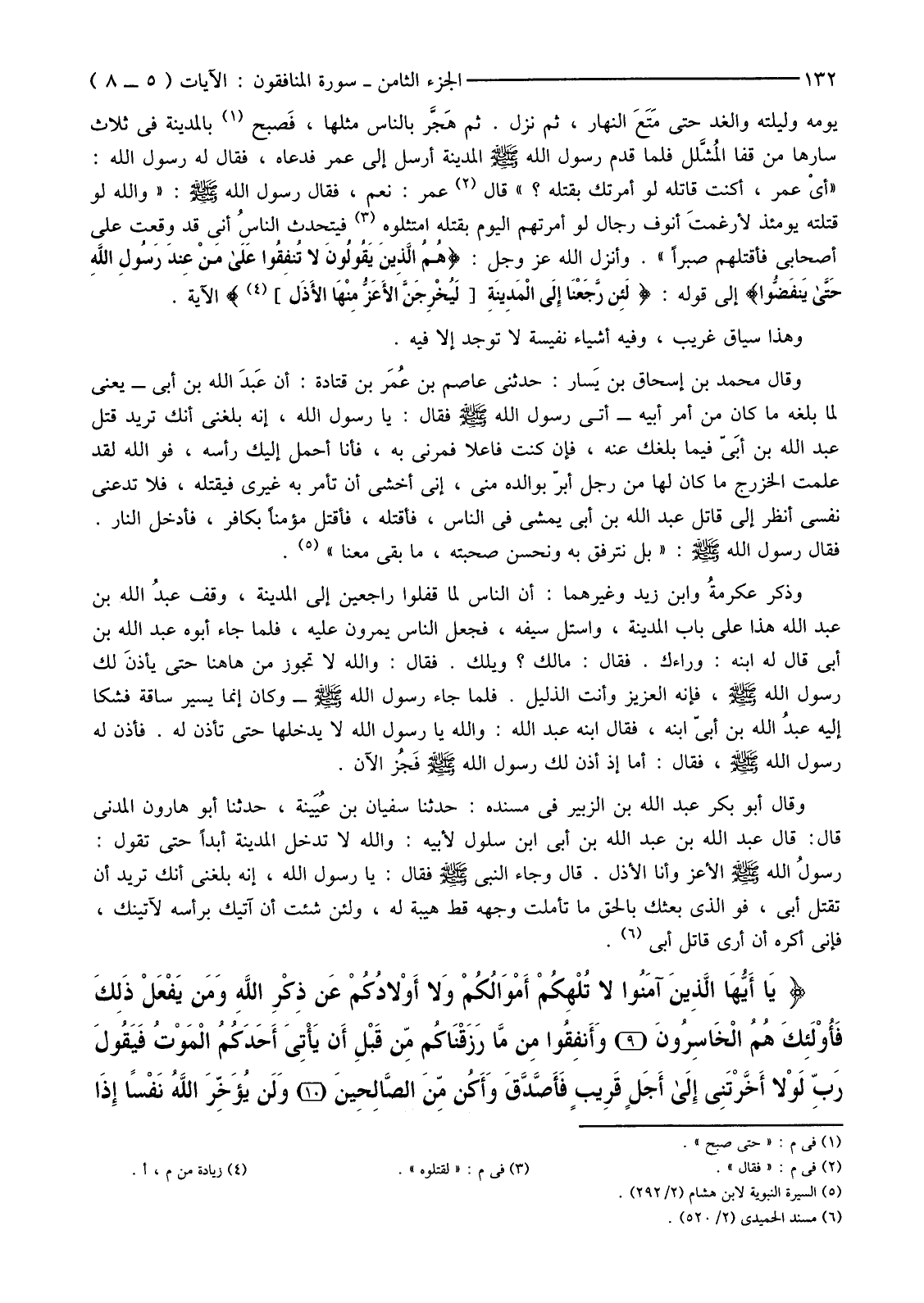 يَوْمَهُ وَلَيْلَتَهُ وَالْغَدَ حَتَّى مَتَعَ النَّهَارُ، ثُمَّ نَزَلَ. ثُمَّ هَجَّر بِالنَّاسِ مِثْلَهَا، فَصبح (1) بِالْمَدِينَةِ فِي ثَلَاثٍ سَارَهَا مِنْ قَفَا المُشلَّل فَلَمَّا قَدِمَ رَسُولُ اللَّهِ صَلَّى اللَّهُ عَلَيْهِ وَسَلَّمَ الْمَدِينَةَ أَرْسَلَ إِلَى عُمَرَ فَدَعَاهُ، فَقَالَ لَهُ رَسُولُ اللَّهِ: "أَيْ ْعمر، أَكُنْتَ قَاتِلَهُ لَوْ أَمَرْتُكَ بِقَتْلِهِ؟ " قَالَ (2) عُمَرُ: نَعَمْ، فَقَالَ رَسُولُ اللَّهِ صَلَّى اللَّهُ عَلَيْهِ وَسَلَّمَ: "وَاللَّهِ لَوْ قَتَلْتَهُ يَوْمَئِذٍ لأرغمتَ أُنُوفَ رِجَالٍ لَوْ أَمَرْتُهُمُ الْيَوْمَ بِقَتْلِهِ امْتَثَلُوهُ (3) فَيَتَحَدَّثُ الناسُ أَنِّي قَدْ وَقَعْتُ عَلَى أَصْحَابِي فَأَقْتُلُهُمْ صَبْرًا". وَأَنْزَلَ اللَّهُ عَزَّ وَجَلَّ: {هُمُ الَّذِينَ يَقُولُونَ لَا تُنْفِقُوا عَلَى مَنْ عِنْدَ رَسُولِ اللَّهِ حَتَّى يَنْفَضُّوا} إِلَى قَوْلِهِ: {لَئِنْ رَجَعْنَا إلَى الْمَدِينَةِ [لَيُخْرِجَنَّ الأعَزُّ مِنْهَا الأذَل] } (4) الْآيَةَ.