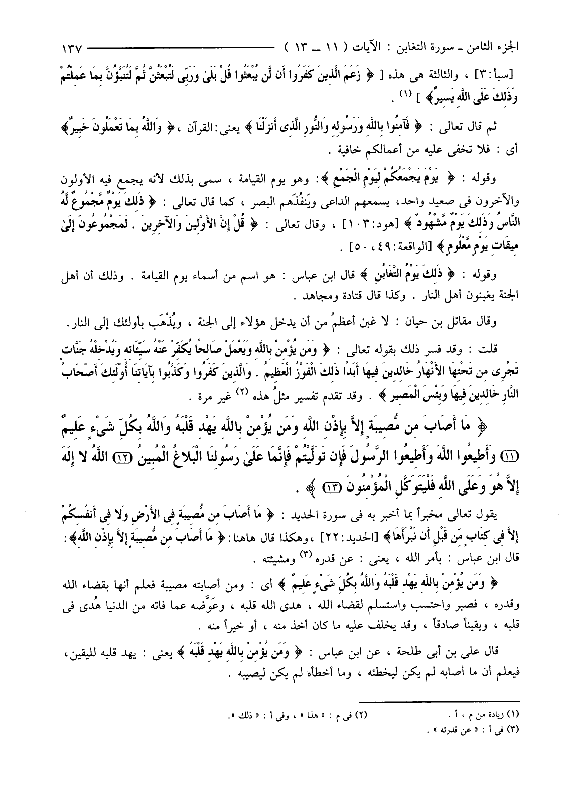 قُلْتُ: وَقَدْ فُسِّرَ ذَلِكَ بِقَوْلِهِ تَعَالَى: {وَمَنْ يُؤْمِنْ بِاللَّهِ وَيَعْمَلْ صَالِحًا يُكَفِّرْ عَنْهُ سَيِّئَاتِهِ وَيُدْخِلْهُ جَنَّاتٍ تَجْرِي مِنْ تَحْتِهَا الأنْهَارُ خَالِدِينَ فِيهَا أَبَدًا ذَلِكَ الْفَوْزُ الْعَظِيمُ وَالَّذِينَ كَفَرُوا وَكَذَّبُوا بِآيَاتِنَا أُولَئِكَ أَصْحَابُ النَّارِ خَالِدِينَ فِيهَا وَبِئْسَ الْمَصِيرُ} وَقَدْ تَقَدَّمَ تَفْسِيرُ مثلُ هَذِهِ (2) غَيْرَ مَرَّةٍ.