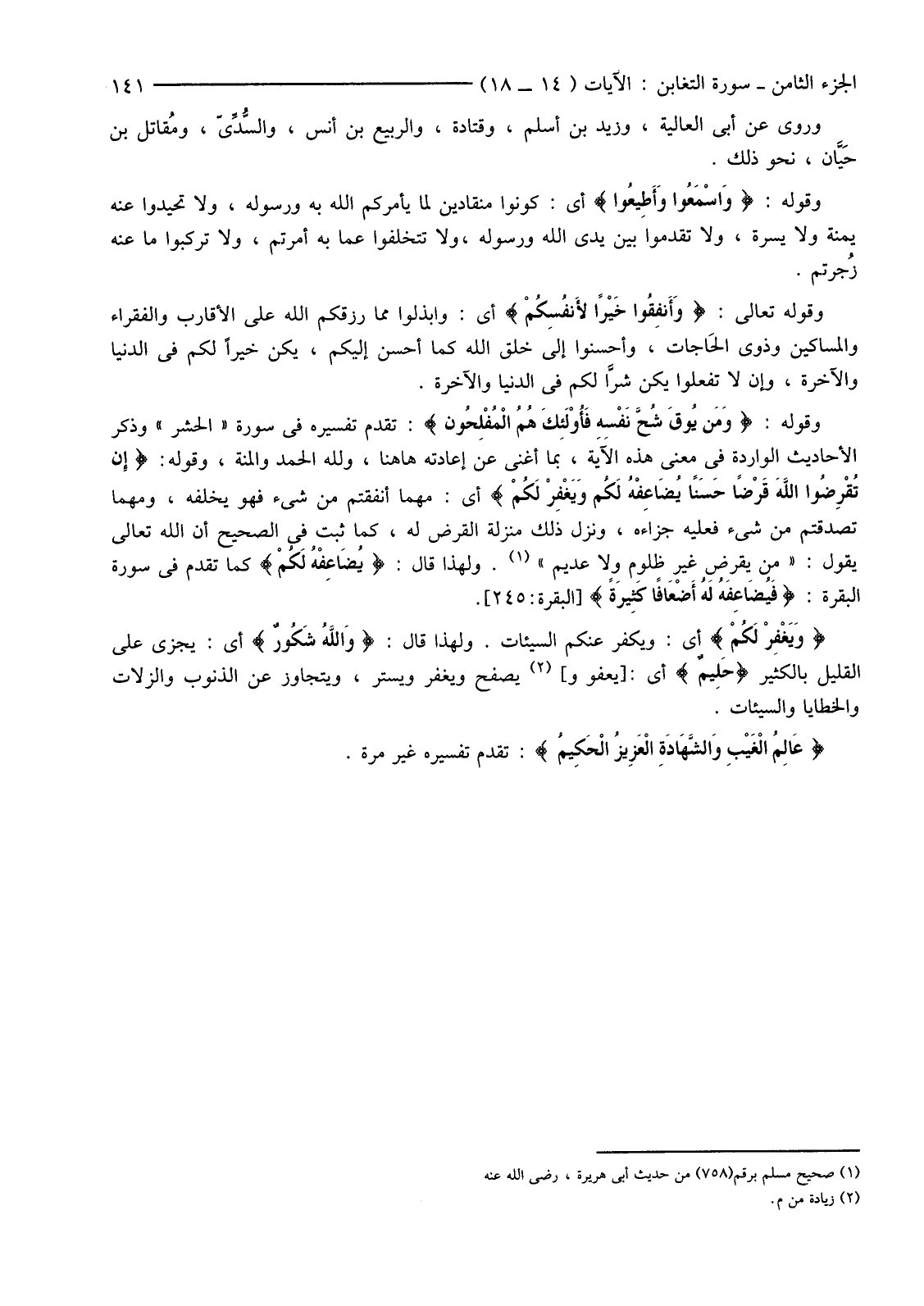 وَقَوْلُهُ: {وَمَنْ يُوقَ شُحَّ نَفْسِهِ فَأُولَئِكَ هُمُ الْمُفْلِحُونَ} تَقَدَّمَ تَفْسِيرُهُ فِي سُورَةِ "الْحَشْرِ" وَذِكْرُ الْأَحَادِيثِ الْوَارِدَةِ فِي مَعْنَى هَذِهِ الْآيَةِ، بِمَا أَغْنَى عَنْ إِعَادَتِهِ هَا هُنَا، وَلِلَّهِ الْحَمْدُ وَالْمِنَّةُ،