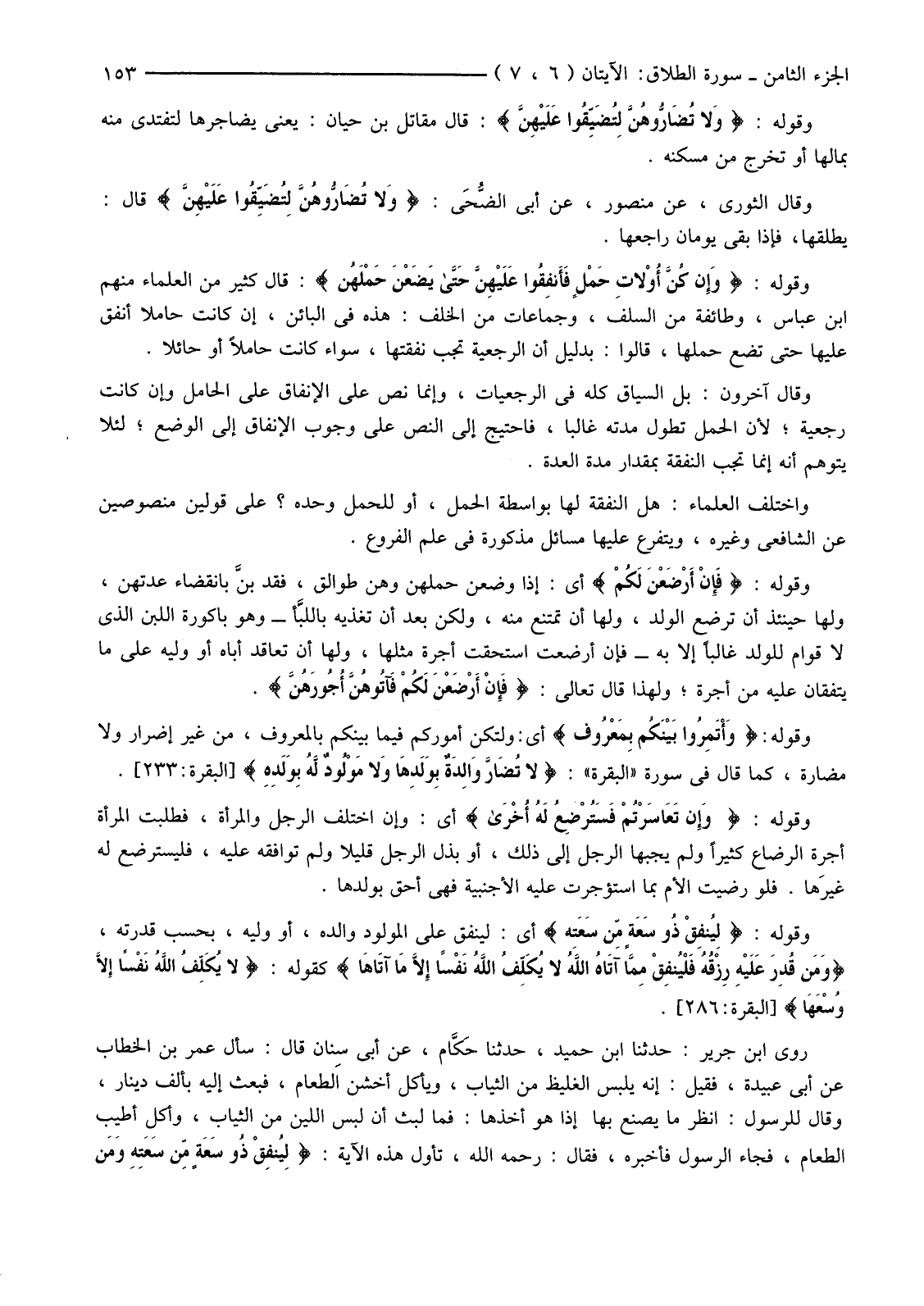 وَقَوْلُهُ: {وَإِنْ كُنَّ أُولاتِ حَمْلٍ فَأَنْفِقُوا عَلَيْهِنَّ حَتَّى يَضَعْنَ حَمْلَهُنَّ} قَالَ كَثِيرٌ مِنَ الْعُلَمَاءِ مِنْهُمُ ابْنُ عَبَّاسٍ، وَطَائِفَةٌ مِنَ السَّلَفِ، وَجَمَاعَاتٌ مِنَ الْخَلَفِ: هَذِهِ فِي الْبَائِنِ، إِنْ كَانَتْ حَامِلًا أَنْفَقَ عَلَيْهَا حَتَّى تَضَعَ حَمْلَهَا، قَالُوا: بِدَلِيلِ أَنَّ الرَّجْعِيَّةَ تَجِبُ نَفَقَتُهَا، سَوَاءٌ كَانَتْ حَامِلًا أَوْ حَائِلًا.