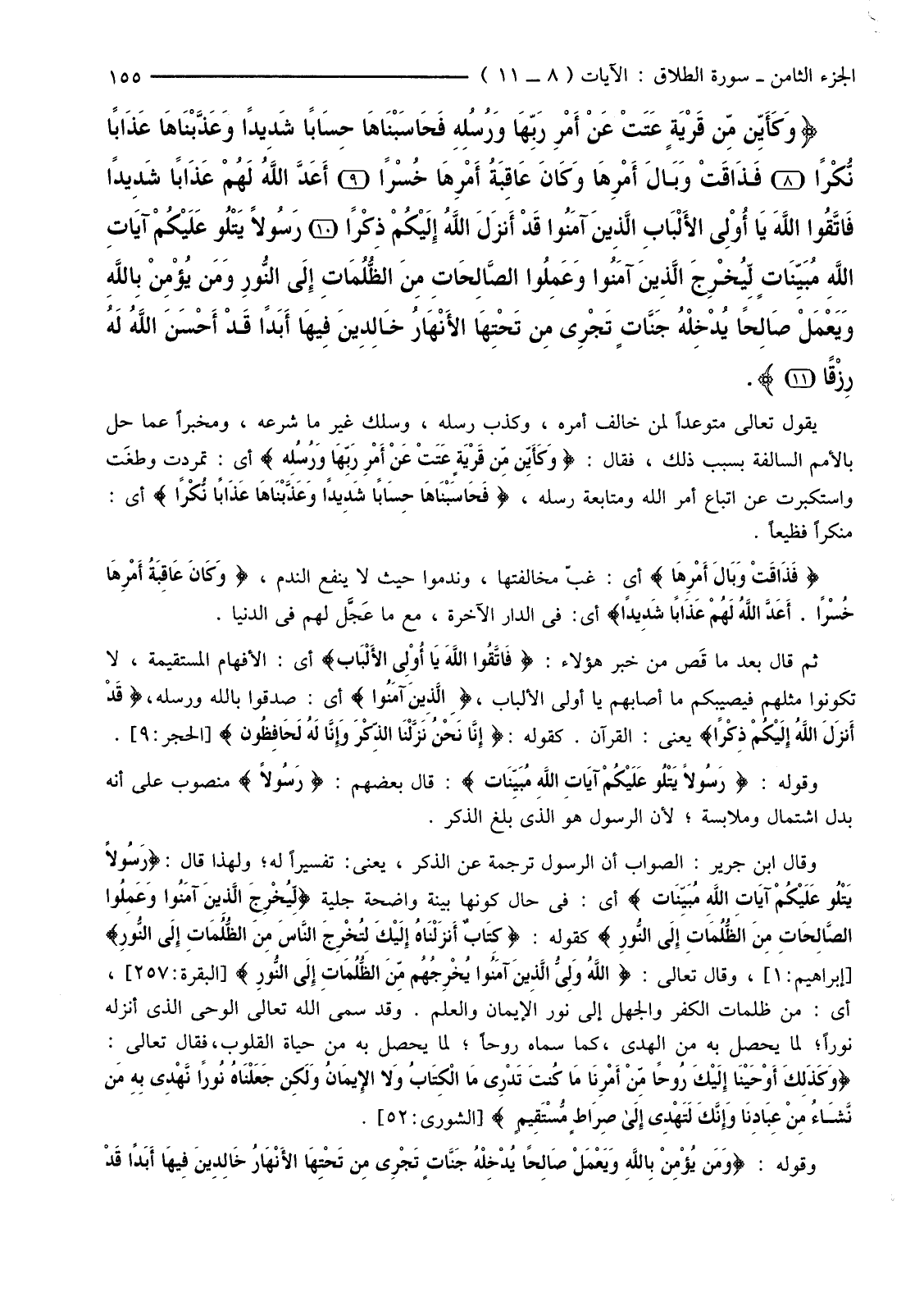 {وَكَأَيِّنْ مِنْ قَرْيَةٍ عَتَتْ عَنْ أَمْرِ رَبِّهَا وَرُسُلِهِ فَحَاسَبْنَاهَا حِسَابًا شَدِيدًا وَعَذَّبْنَاهَا عَذَابًا نُكْرًا (8) فَذَاقَتْ وَبَالَ أَمْرِهَا وَكَانَ عَاقِبَةُ أَمْرِهَا خُسْرًا (9) أَعَدَّ اللَّهُ لَهُمْ عَذَابًا شَدِيدًا فَاتَّقُوا اللَّهَ يَا أُولِي الألْبَابِ الَّذِينَ آمَنُوا قَدْ أَنزلَ اللَّهُ إِلَيْكُمْ ذِكْرًا (10) رَسُولا يَتْلُو عَلَيْكُمْ آيَاتِ اللَّهِ مُبَيِّنَاتٍ لِيُخْرِجَ الَّذِينَ آمَنُوا وَعَمِلُوا الصَّالِحَاتِ مِنَ الظُّلُمَاتِ إِلَى النُّورِ وَمَنْ يُؤْمِنْ بِاللَّهِ وَيَعْمَلْ صَالِحًا يُدْخِلْهُ جَنَّاتٍ تَجْرِي مِنْ تَحْتِهَا الأنْهَارُ خَالِدِينَ فِيهَا أَبَدًا قَدْ أَحْسَنَ اللَّهُ لَهُ رِزْقًا (11) }