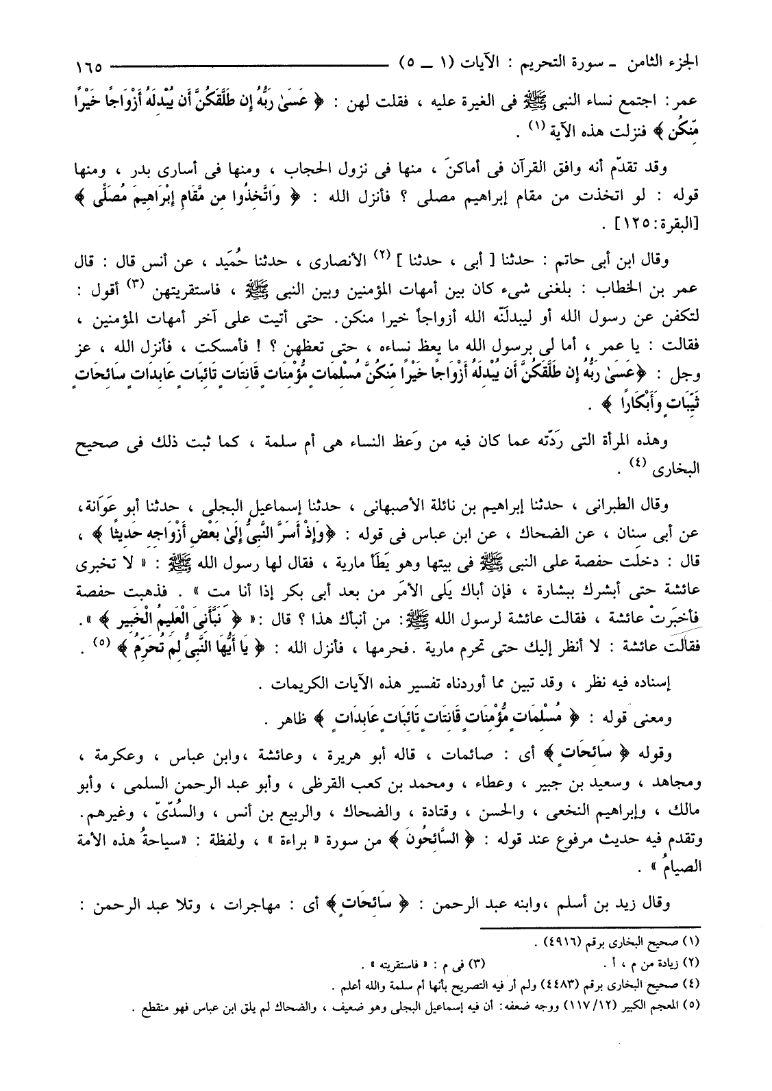 إِسْنَادُهُ فِيهِ نَظَرٌ، وَقَدْ تَبَيَّنَ مِمَّا أَوْرَدْنَاهُ تَفْسِيرُ هَذِهِ الْآيَاتِ الْكَرِيمَاتِ. وَمَعْنَى قَوْلِهِ: {مُسْلِمَاتٍ مُؤْمِنَاتٍ قَانِتَاتٍ تَائِبَاتٍ عَابِدَاتٍ} ظَاهِرٌ.