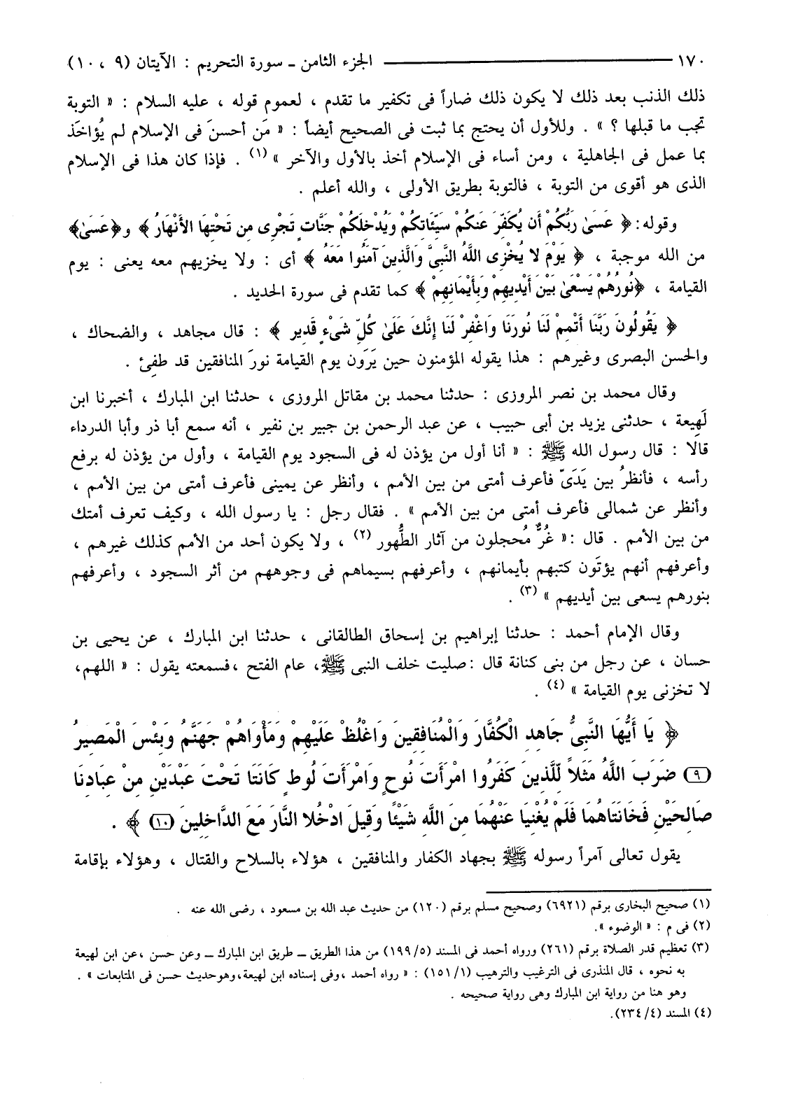ذَلِكَ الذَّنْبُ بَعْدَ ذَلِكَ لَا يَكُونُ ذَلِكَ ضَارًّا فِي تَكْفِيرِ مَا تَقَدَّمَ، لِعُمُومِ قَوْلِهِ، عَلَيْهِ السَّلَامُ: "التَّوْبَةُ تَجُبُّ مَا قَبْلَهَا؟ ". وَلِلْأَوَّلِ أَنْ يَحْتَجَّ بِمَا ثَبَتَ فِي الصَّحِيحِ أَيْضًا: "مَن أحسنَ فِي الْإِسْلَامِ لَمْ يُؤاخَذ بِمَا عَمِلَ فِي الْجَاهِلِيَّةِ، وَمَنْ أَسَاءَ فِي الْإِسْلَامِ أُخِذَ بِالْأَوَّلِ وَالْآخِرِ" (1) فَإِذَا كَانَ هَذَا فِي الْإِسْلَامِ الَّذِي هُوَ أَقْوَى مِنَ التَّوْبَةِ، فَالتَّوْبَةُ بِطَرِيقِ الْأَوْلَى، وَاللَّهُ أَعْلَمُ. وَقَوْلُهُ: {عَسَى رَبُّكُمْ أَنْ يُكَفِّرَ عَنْكُمْ سَيِّئَاتِكُمْ وَيُدْخِلَكُمْ جَنَّاتٍ تَجْرِي مِنْ تَحْتِهَا الأنْهَارُ} وَ {عَسَى} مِنَ اللَّهِ مُوجِبَةٌ، {يَوْمَ لَا يُخْزِي اللَّهُ النَّبِيَّ وَالَّذِينَ آمَنُوا مَعَهُ} أَيْ: وَلَا يُخْزِيهِمْ مَعَهُ يَعْنِي: يَوْمَ الْقِيَامَةِ، {نُورُهُمْ يَسْعَى بَيْنَ أَيْدِيهِمْ وَبِأَيْمَانِهِمْ} كَمَا تَقَدَّمَ فِي سُورَةِ الْحَدِيدِ.