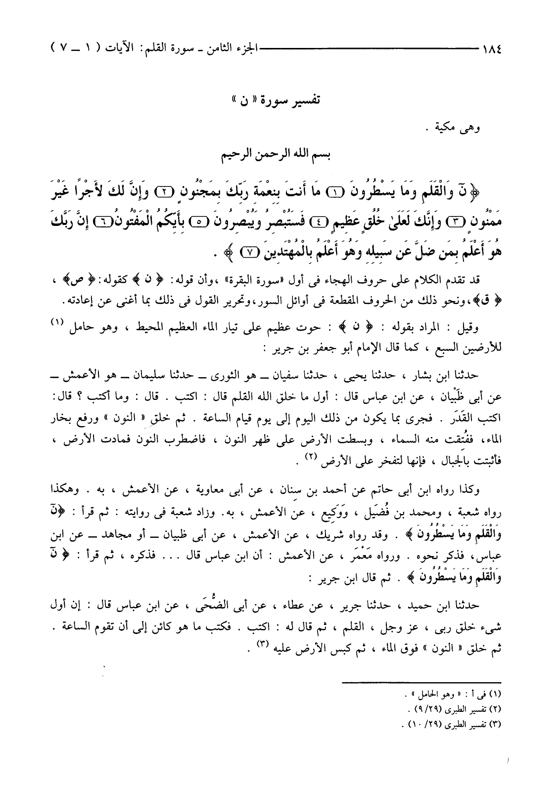 وَكَذَا رَوَاهُ ابْنُ أَبِي حَاتِمٍ عَنْ أَحْمَدَ بْنِ سِنان، عَنْ أَبِي مُعَاوِيَةَ، عَنِ الْأَعْمَشِ، بِهِ. وَهَكَذَا رَوَاهُ شُعْبَةُ، وَمُحَمَّدُ بْنُ فُضَيل، وَوَكِيع، عَنِ الْأَعْمَشِ، بِهِ. وَزَادَ شُعْبَةُ فِي رِوَايَتِهِ: ثُمَّ قَرَأَ: {ن وَالْقَلَمِ وَمَا يَسْطُرُونَ} وَقَدْ رَوَاهُ شَرِيكٌ، عَنِ الْأَعْمَشِ، عَنْ أَبِي ظَبْيَانَ -أَوْ مُجَاهِدٍ-عَنِ ابْنِ عَبَّاسٍ، فَذَكَرَ نَحْوَهُ. وَرَوَاهُ مَعْمَر، عَنِ الْأَعْمَشِ: أَنَّ ابْنَ عَبَّاسٍ قَالَ ... فَذَكَرَهُ، ثُمَّ قَرَأَ: {ن وَالْقَلَمِ وَمَا يَسْطُرُونَ} ثُمَّ قَالَ ابْنُ جَرِيرٍ: حَدَّثَنَا ابْنُ حُمَيْدٍ، حَدَّثَنَا جَرِيرٌ، عَنْ عَطَاءٍ، عَنْ أَبِي الضُّحَى، عَنِ ابْنِ عَبَّاسٍ قَالَ: إِنَّ أَوَّلَ شَيْءٍ خَلَقَ رَبِّي، عَزَّ وَجَلَّ، الْقَلَمُ، ثُمَّ قَالَ لَهُ: اكْتُبْ. فَكَتَبَ مَا هُوَ كَائِنٌ إِلَى أَنْ تَقُومَ السَّاعَةُ. ثُمَّ خَلَقَ "النُّونَ" فَوْقَ الْمَاءِ، ثُمَّ كَبَسَ الأرض عليه (3) .