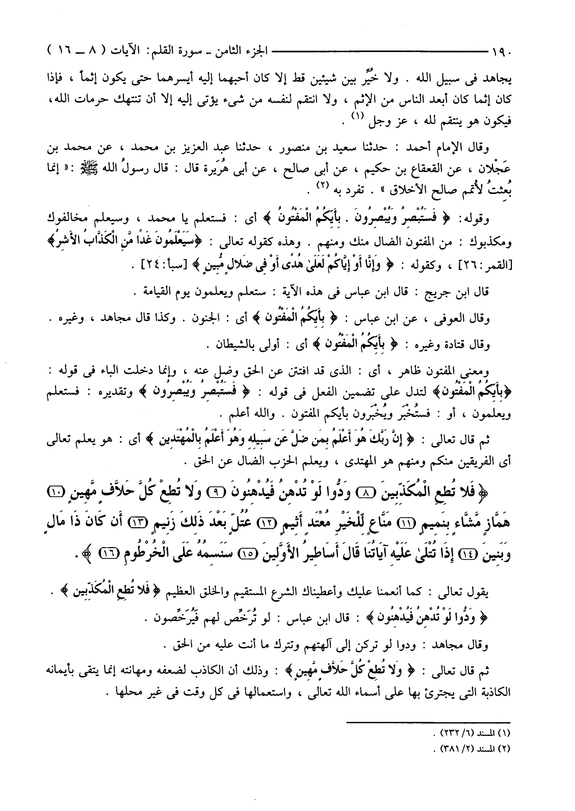 {فَلا تُطِعِ الْمُكَذِّبِينَ (8) وَدُّوا لَوْ تُدْهِنُ فَيُدْهِنُونَ (9) وَلا تُطِعْ كُلَّ حَلافٍ مَهِينٍ (10) هَمَّازٍ مَشَّاءٍ بِنَمِيمٍ (11) مَنَّاعٍ لِلْخَيْرِ مُعْتَدٍ أَثِيمٍ (12) عُتُلٍّ بَعْدَ ذَلِكَ زَنِيمٍ (13) أَنْ كَانَ ذَا مَالٍ وَبَنِينَ (14) إِذَا تُتْلَى عَلَيْهِ آيَاتُنَا قَالَ أَسَاطِيرُ الأوَّلِينَ (15) }