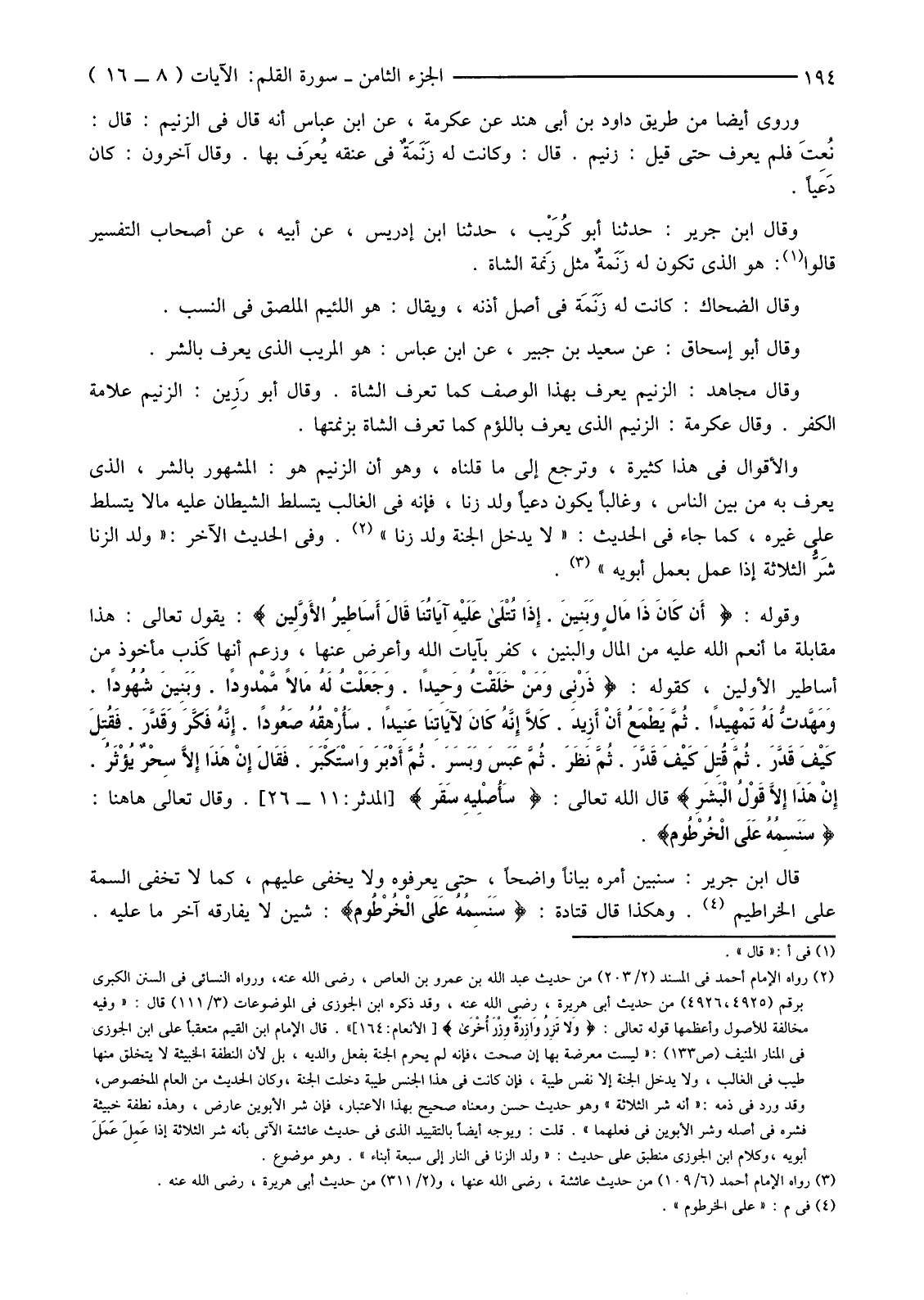 وَالْأَقْوَالُ فِي هَذَا كَثِيرَةٌ، وَتَرْجِعُ إِلَى مَا قُلْنَاهُ، وَهُوَ أَنَّ الزَّنِيمَ هُوَ: الْمَشْهُورُ بِالشَّرِّ، الَّذِي يُعْرَفُ بِهِ مِنْ بَيْنِ الناس، وغالبًا يكون دعيًا وله زِنًا، فَإِنَّهُ فِي الْغَالِبِ يَتَسَلَّطُ الشَّيْطَانُ عَلَيْهِ مَا لَا يَتَسَلَّطُ عَلَى غَيْرِهِ، كَمَا جَاءَ فِي الْحَدِيثِ: "لَا يَدْخُلُ الْجَنَّةَ وَلَدُ زِنًا" (2) وَفِي الْحَدِيثِ الْآخَرِ: "وَلَدُ الزِّنَا شَرُّ الثَّلَاثَةِ إِذَا عَمِلَ بِعَمَلِ أَبَوَيْهِ" (3) .