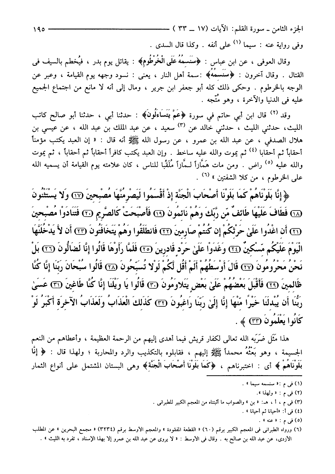 {إِنَّا بَلَوْنَاهُمْ كَمَا بَلَوْنَا أَصْحَابَ الْجَنَّةِ إِذْ أَقْسَمُوا لَيَصْرِمُنَّهَا مُصْبِحِينَ (17) وَلا يَسْتَثْنُونَ (18) فَطَافَ عَلَيْهَا طَائِفٌ مِنْ رَبِّكَ وَهُمْ نَائِمُونَ (19) فَأَصْبَحَتْ كَالصَّرِيمِ (20) فَتَنَادَوْا مُصْبِحِينَ (21) أَنِ اغْدُوا عَلَى حَرْثِكُمْ إِنْ كُنْتُمْ صَارِمِينَ (22) فَانْطَلَقُوا وَهُمْ يَتَخَافَتُونَ (23) أَنْ لَا يَدْخُلَنَّهَا الْيَوْمَ عَلَيْكُمْ مِسْكِينٌ (24) وَغَدَوْا عَلَى حَرْدٍ قَادِرِينَ (25) فَلَمَّا رَأَوْهَا قَالُوا إِنَّا لَضَالُّونَ (26) بَلْ نَحْنُ مَحْرُومُونَ (27) قَالَ أَوْسَطُهُمْ أَلَمْ أَقُلْ لَكُمْ لَوْلا تُسَبِّحُونَ (28) قَالُوا سُبْحَانَ رَبِّنَا إِنَّا كُنَّا ظَالِمِينَ (29) فَأَقْبَلَ بَعْضُهُمْ عَلَى بَعْضٍ يَتَلاوَمُونَ (30) قَالُوا يَا وَيْلَنَا إِنَّا كُنَّا طَاغِينَ (31) عَسَى رَبُّنَا أَنْ يُبْدِلَنَا خَيْرًا مِنْهَا إِنَّا إِلَى رَبِّنَا رَاغِبُونَ (32) كَذَلِكَ الْعَذَابُ وَلَعَذَابُ الآخِرَةِ أَكْبَرُ لَوْ كَانُوا يَعْلَمُونَ (33) }