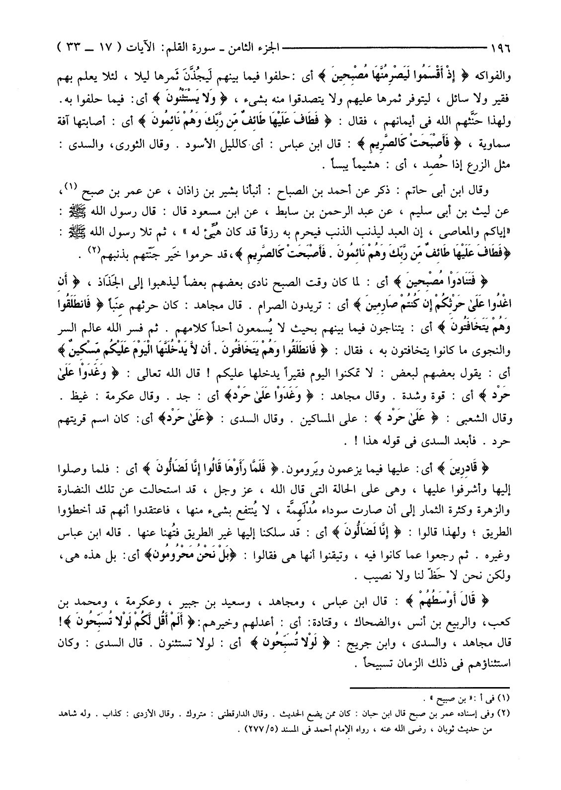 وَالْفَوَاكِهِ {إِذْ أَقْسَمُوا لَيَصْرِمُنَّهَا مُصْبِحِينَ} أَيْ: حَلَفُوا فِيمَا بَيْنَهُمْ لَيجُذَّنَ ثَمرها لَيْلًا لِئَلَّا يَعْلَمَ بِهِمْ فَقِيرٌ وَلَا سَائِلٌ، لِيَتَوَفَّرَ ثَمَرُهَا عَلَيْهِمْ وَلَا يَتَصَدَّقُوا مِنْهُ بِشَيْءٍ، {وَلا يَسْتَثْنُونَ} أَيْ: فِيمَا حَلَفُوا بِهِ. وَلِهَذَا حَنَّثَهُمُ اللَّهُ فِي أَيْمَانِهِمْ، فَقَالَ: {فَطَافَ عَلَيْهَا طَائِفٌ مِنْ رَبِّكَ وَهُمْ نَائِمُونَ} أَيْ: أَصَابَتْهَا آفَةٌ سَمَاوِيَّةٌ، {فَأَصْبَحَتْ كَالصَّرِيمِ} قَالَ ابْنُ عَبَّاسٍ: أَيْ كَاللَّيْلِ الْأَسْوَدِ. وَقَالَ الثَّوْرِيُّ، وَالسُّدِّيُّ: مِثْلَ الزَّرْعِ إِذَا حُصِد، أَيْ هَشِيمًا يَبَسًا.