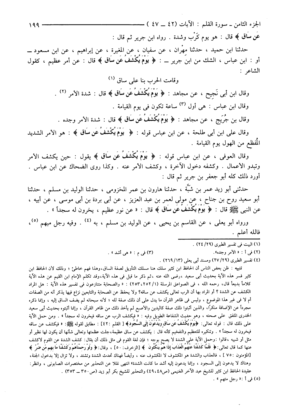 تنبيه: ظن بعض الناس أن الحافظ ابن كثير سلك هنا مسلك التأويل لصفة الساق، وهذا فهم خاطئ؛ وذلك لأن الحافظ ابن كثير فسر هذه الآية بحديث أبي سعيد، رضي الله عنه، ثم ذكر ما قيل في هذه الآية، وقد تكلم الإمام ابن القيم عن هذه الآية كلامًا بديعًا قال، رحمه الله، في الصواعق المرسلة (1/252، 253) : "والصحابة متنازعون في تفسير هذه الآية: هل المراد الكشف عن الشدة؟ أو المراد بها أن الرب تعالى يكشف عن ساقه؟ ولا يحفظ عن الصحابة والتابعين نزاع فيها يذكر أنه من الصفات أم لا في غير هذا الموضوع، وليس في ظاهر القرآن ما يدل على أن ذلك صفة لله؛ لأنه سبحانه لم يضف الساق إليه، وإنما ذكره مجردًا عن الإضافة منكرًا، والذين أثبتوا ذلك صفة كاليدين والأصبع لم يأخذ ذلك من ظاهر القرآن، وإنما أثبتوه بحديث أبي سعيد الخدري المتفق على صحته، وهو حديث الشفاعة الطويل وفيه: "فيكشف الرب عن ساقه فيخرون له سجدًا". ومن حمل الآية على ذلك قال: قوله تَعَالَى: "يَوْمَ يُكْشَفُ عَنْ سَاقٍ وَيُدْعَوْنَ إِلَى السُّجُودِ" القلم: 42: مطابق لقوله صلى الله عليه وسلم: "فيكشف عن ساقة فيخرون له سجدًا". وتنكيره للتعظيم والتفخيم كأنه قال: يكشف عن ساق عظيمة، جلت عظمتها وتعالى شأنها أن يكون لها نظير أو مثل أو شبيه، قالوا: وحمل الآية على الشدة لا يصح بوجه؛ فإن لغة القوم في مثل ذلك أن يقال: كشف الشدة عن القوم لا كشف عنها كما قال تعالى: "فلما كشفنا عنهم العذاب إذا هم ينكثون" الزخرف: 50، وقال "ولو رحمناهم وكشفنا ما بهم من ضر" المؤمنون: 75، فالعذاب والشدة هو المكشوف لا المكشوف عنه، وأيضًا فهناك تحدث الشدة وتشتد، ولا تزال إلا بدخول الجنة، وهناك لا يدعون إلى السجود، وإنما يدعون إليه أشد ما كانت الشدة" انتهى نقلا عن التحذير من مختصرات الصابوني، وانظر: عقيدة الحافظ ابن كثير للشيخ عبد الآخر الغنيمي (ص48، 49) والتحذير للشيخ بكر أبو زيد (ص350 - 353) .