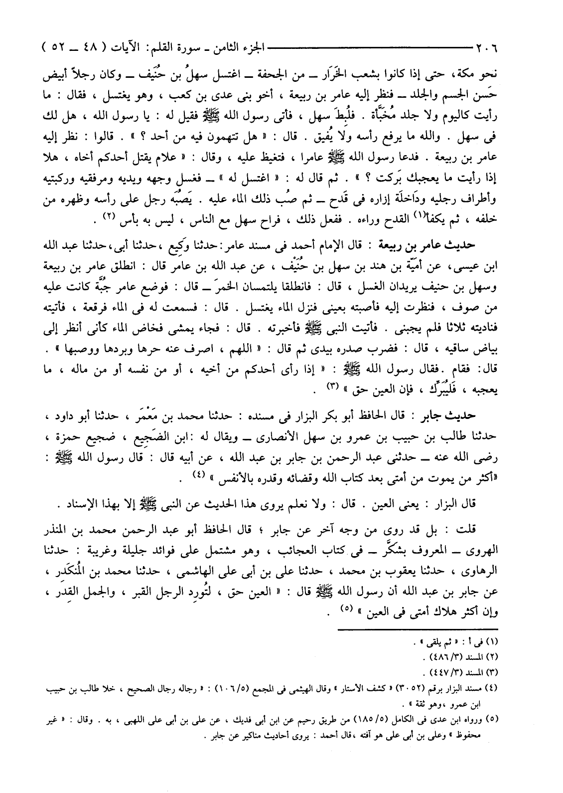 حَدِيثُ عَامِرِ بْنِ رَبِيعَةَ: "قَالَ الْإِمَامُ أَحْمَدُ فِي مُسْنَدِ عَامِرٍ: حَدَّثَنَا وَكِيع، حَدَّثَنَا أَبِي، حَدَّثَنَا عَبْدُ اللَّهِ بْنُ عِيسَى، عَنْ أمَيّة بْنِ هِنْدِ بْنِ سَهْلِ بْنِ حُنَيْف، عَنْ عَبْدِ اللَّهِ بْنِ عَامِرٍ قَالَ: انْطَلَقَ عَامِرُ بْنُ رَبِيعَةَ وَسَهْلُ بْنُ حَنِيفٍ يُرِيدَانِ الْغُسْلَ، قَالَ: فَانْطَلَقَا يَلْتَمِسَانِ الخمرَ -قَالَ: فَوَضْعَ عَامِرٌ جُبَّة كَانَتْ عَلَيْهِ مِنْ صُوفٍ، فَنَظَرْتُ إِلَيْهِ فَأَصَبْتُهُ بِعَيْنِي فَنَزَلَ الْمَاءَ يَغْتَسِلُ. قَالَ: فَسَمِعْتُ لَهُ فِي الْمَاءِ فَرْقَعَةً، فَأَتَيْتُهُ فَنَادَيْتُهُ ثَلَاثًا فَلَمْ يُجِبْنِي. فَأَتَيْتُ النَّبِيَّ صَلَّى اللَّهُ عَلَيْهِ وَسَلَّمَ فَأَخْبَرْتُهُ. قَالَ: فَجَاءَ يَمْشِي فَخَاضَ الْمَاءَ كَأَنِّي أَنْظُرُ إِلَى بَيَاضِ سَاقَيْهِ، قَالَ: فَضَرَبَ صَدْرَهُ بِيَدِهِ ثُمَّ قَالَ: "اللَّهُمَّ اصْرِفْ عَنْهُ حَرَّهَا وَبَرْدَهَا وَوَصَبَهَا". قَالَ: فَقَامَ. فَقَالَ رَسُولُ اللَّهِ صَلَّى اللَّهُ عَلَيْهِ وَسَلَّمَ: "إِذَا رَأَى أَحَدُكُمْ مِنْ أَخِيهِ، أَوْ مِنْ نَفْسِهِ أَوْ مِنْ مَالِهِ، مَا يُعْجِبُهُ، فَليُبَرِّك، فَإِنَّ الْعَيْنَ حَقٌّ" (3) .
