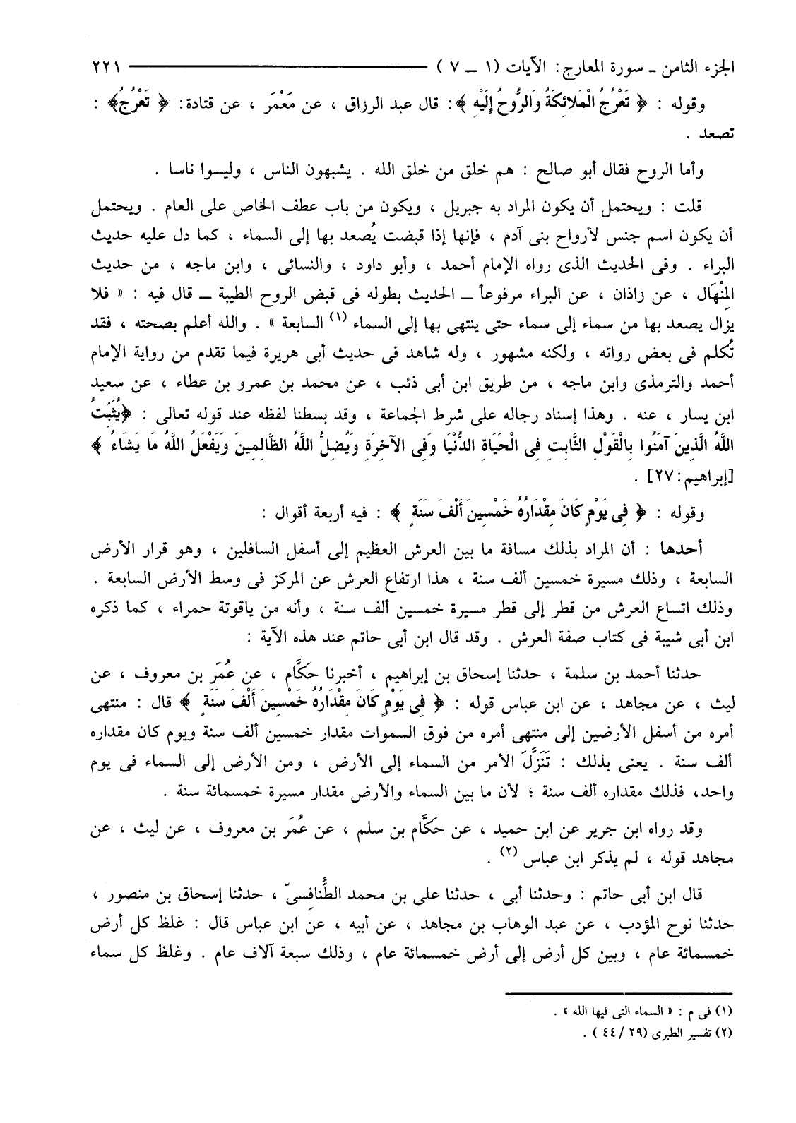 قُلْتُ: وَيُحْتَمَلُ أَنْ يَكُونَ الْمُرَادُ بِهِ جِبْرِيلَ، وَيَكُونَ مِنْ بَابِ عَطْفِ الْخَاصِّ عَلَى الْعَامِّ. وَيُحْتَمَلُ أَنْ يَكُونَ اسْمَ جِنْسٍ لِأَرْوَاحِ بَنِي آدَمَ، فَإِنَّهَا إِذَا قُبِضَتْ يُصعد بِهَا إِلَى السَّمَاءِ، كَمَا دَلَّ عَلَيْهِ حَدِيثُ الْبَرَاءِ. وَفِي الحديث الذي رواه الإمام أَحْمَدُ، وَأَبُو دَاوُدَ، وَالنَّسَائِيُّ، وَابْنُ مَاجَهْ، مِنْ حَدِيثِ المِنْهَال، عَنْ زَاذَانَ، عَنِ الْبَرَاءِ مَرْفُوعًا -الْحَدِيثُ بِطُولِهِ فِي قَبْضِ الرُّوحِ الطَّيِّبَةِ-قَالَ فِيهِ: "فَلَا يَزَالُ يُصْعَدُ بِهَا مِنْ سَمَاءٍ إِلَى سَمَاءٍ حَتَّى يَنْتَهِيَ بِهَا إِلَى السَّمَاءِ (1) السَّابِعَةِ". وَاللَّهُ أَعْلَمُ بِصِحَّتِهِ، فَقَدْ تُكلم فِي بَعْضِ رُوَاتِهِ، وَلَكِنَّهُ مَشْهُورٌ، وَلَهُ شَاهِدٌ فِي حَدِيثِ أَبِي هُرَيْرَة فِيمَا تَقَدَّمَ مِنْ رِوَايَةِ الْإِمَامِ أَحْمَدَ وَالتِّرْمِذِيِّ وَابْنُ مَاجَهْ، مِنْ طَرِيقِ ابْنِ أَبِي ذِئْبٍ، عَنْ مُحَمَّدِ بْنِ عَمْرِو بْنِ عَطَاءٍ، عَنْ سَعِيدِ بْنِ يَسَارٍ، عَنْهُ وَهَذَا إِسْنَادٌ رِجَالُهُ عَلَى شَرْطِ الْجَمَاعَةِ، وَقَدْ بَسَطْنَا لَفْظَهُ عِنْدَ قَوْلِهِ تَعَالَى: {يُثَبِّتُ اللَّهُ الَّذِينَ آمَنُوا بِالْقَوْلِ الثَّابِتِ فِي الْحَيَاةِ الدُّنْيَا وَفِي الآخِرَةِ وَيُضِلُّ اللَّهُ الظَّالِمِينَ وَيَفْعَلُ اللَّهُ مَا يَشَاءُ} [إِبْرَاهِيمَ: 27] .